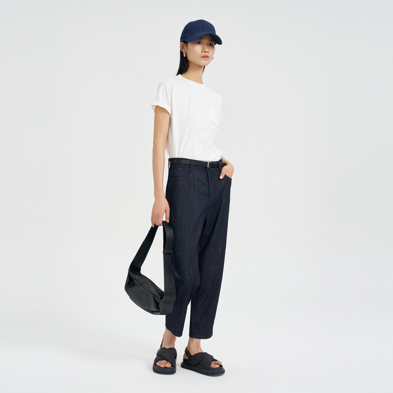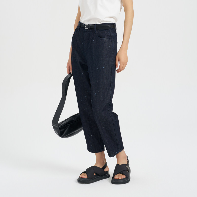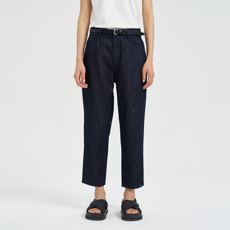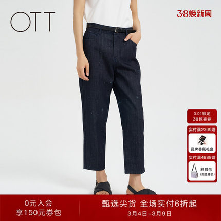 OTT【商场同款】夏新品时髦9分牛仔萝卜裤印花订钻点缀休闲裤女装