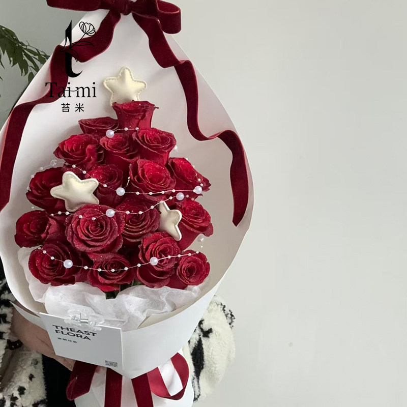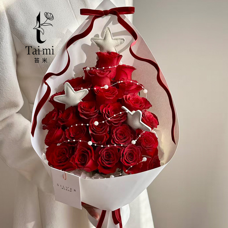 苔米 圣诞树红色玫瑰花束包装纸鲜花礼物装饰配件花艺搭配diy材料
