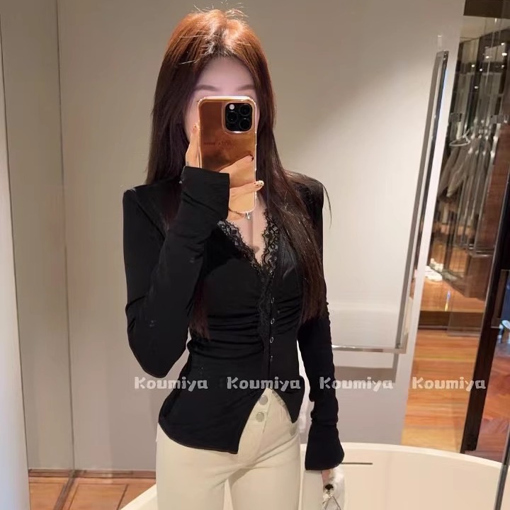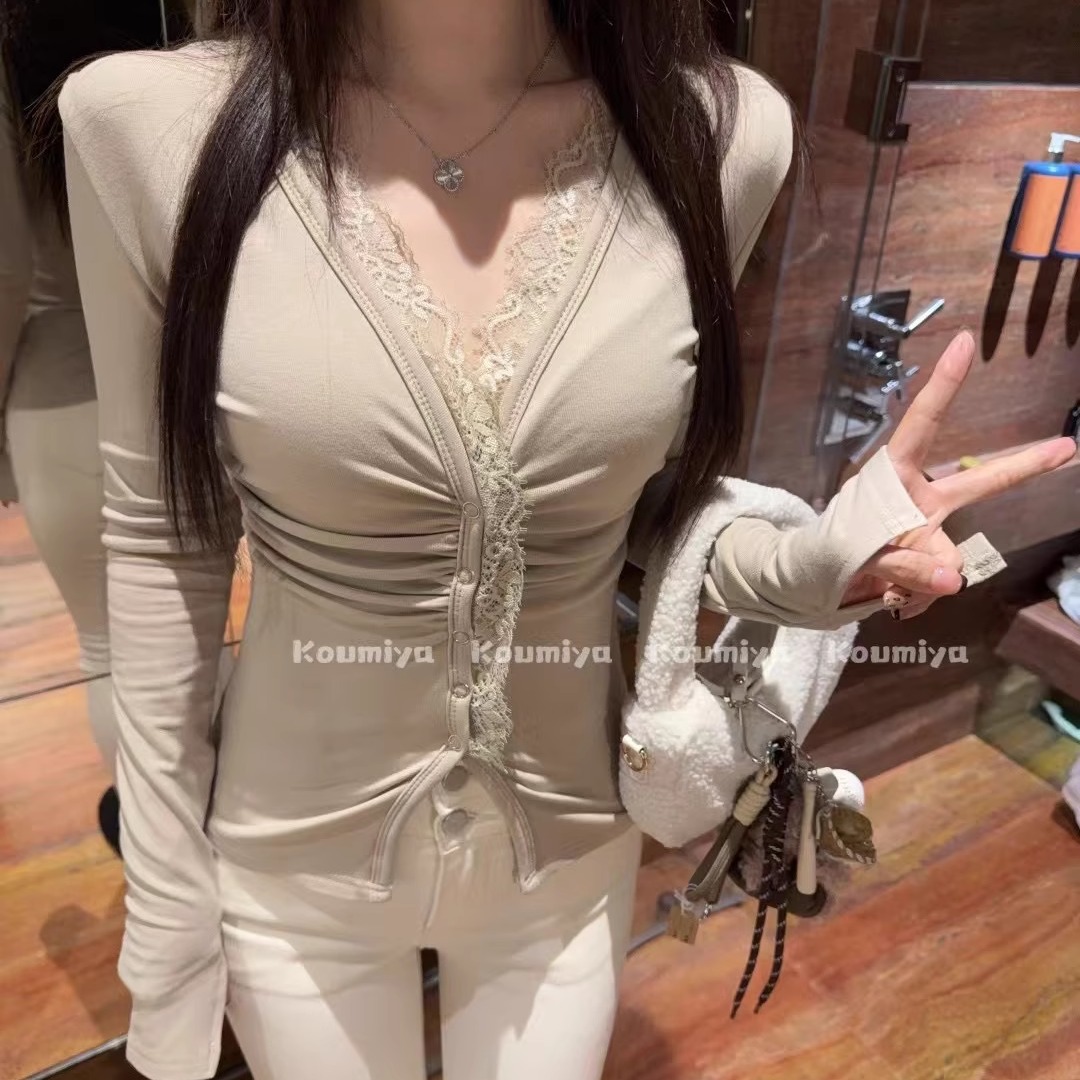 纯欲甜美辣妹韩版蕾丝花边BM风褶皱四合扣加绒长袖T恤内搭打底