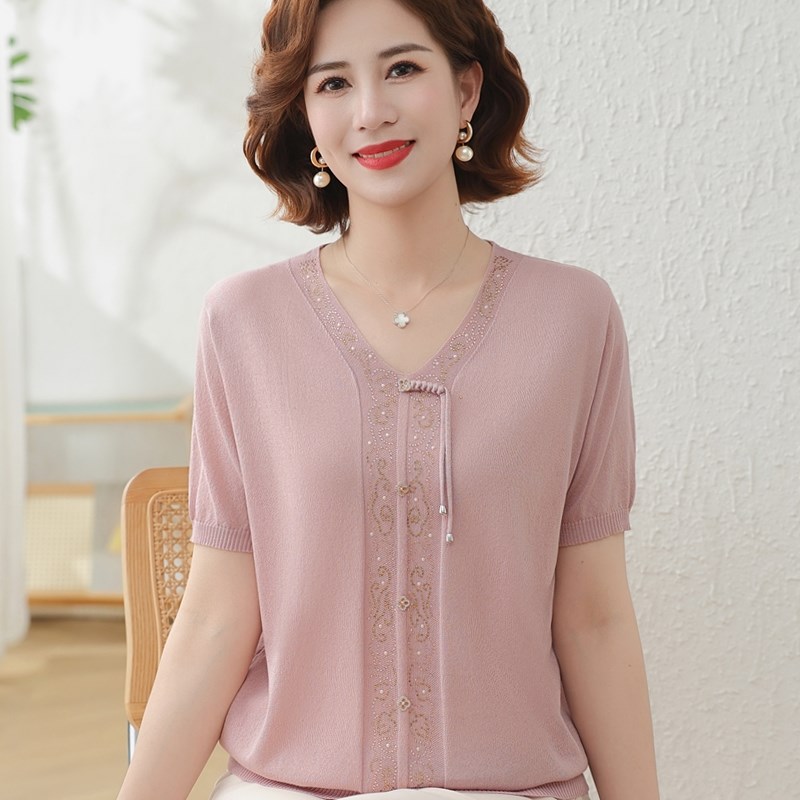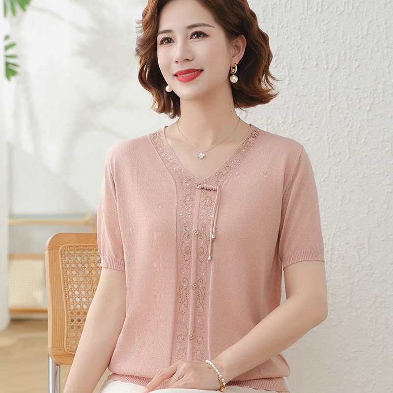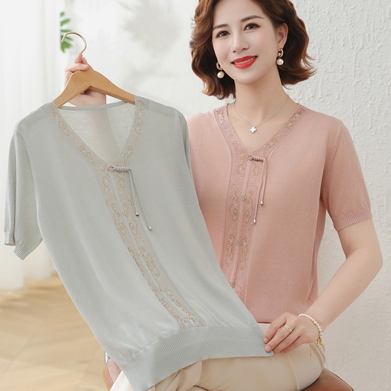 洋气妈妈夏装冰丝小衫国风短袖两件套中老年女大码宽松T恤上衣服