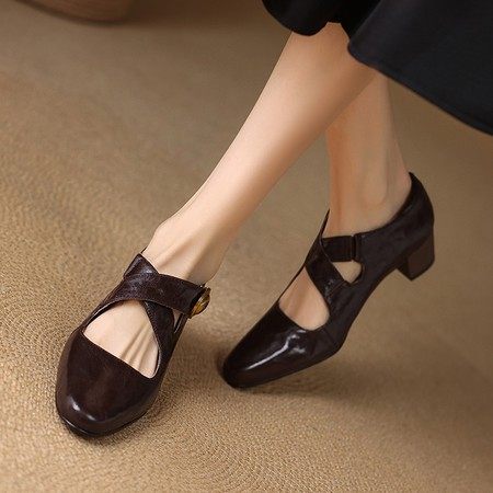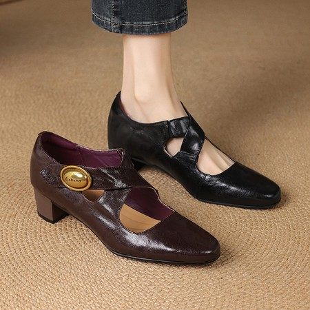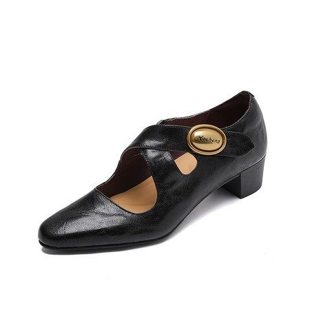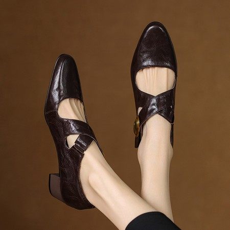 法式气质羊皮单鞋女2025新款春季时尚粗跟中跟交叉带玛丽珍小皮鞋