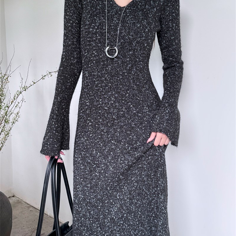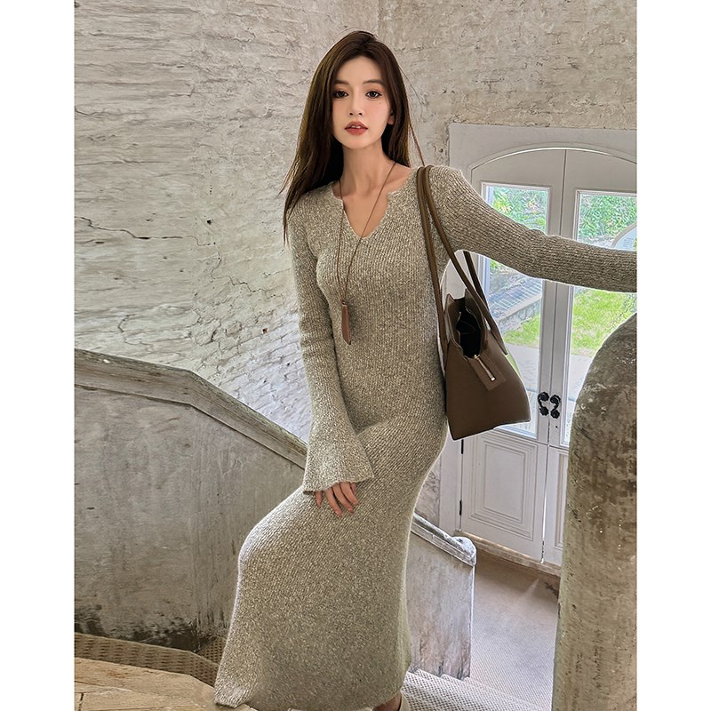 浅布调秋冬高个子V领超好看打底针织连衣裙女修身喇叭袖内搭长裙