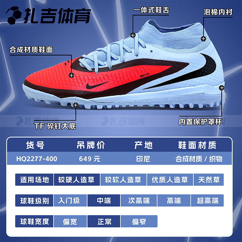 扎吉体育NIKE耐克PHANTOM中端TF碎钉人草男高帮足球鞋HQ2277-400