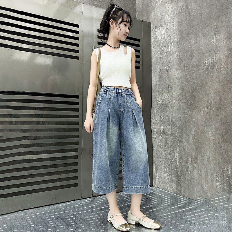 女童牛仔中裤夏季薄款中大儿童宽松阔腿时髦女孩休闲直筒七分裤子
