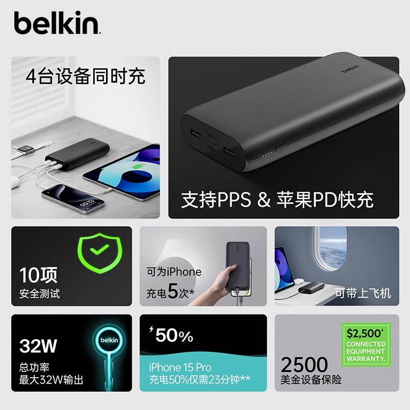Belkin贝尔金32W快充充电宝适苹果iPhone华为可上飞机3C认证安全