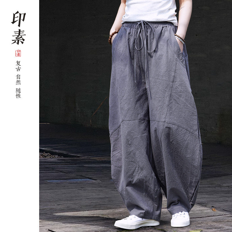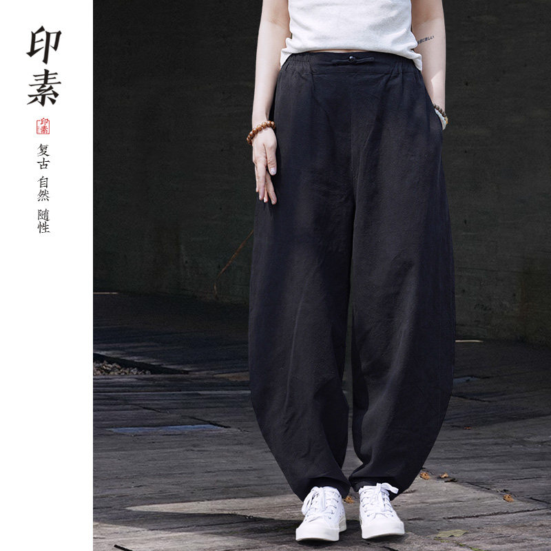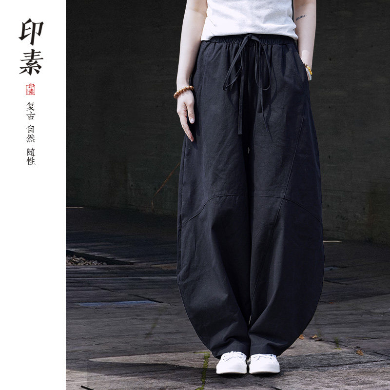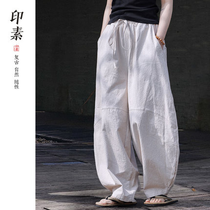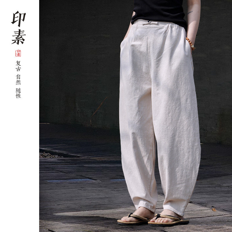 印素亚麻裤男宽松哈伦裤秋款棉麻休闲裤秋季复古情侣风阔腿灯笼裤