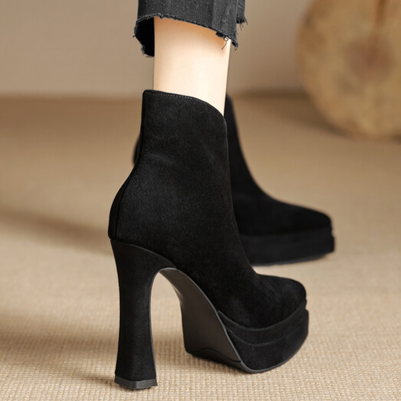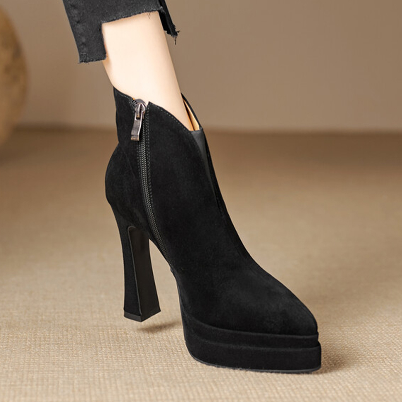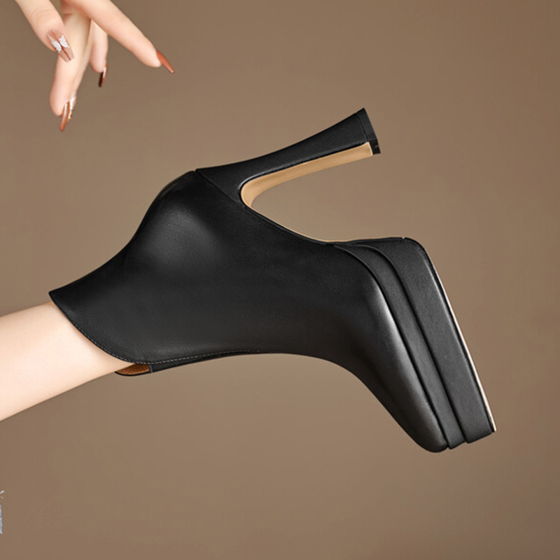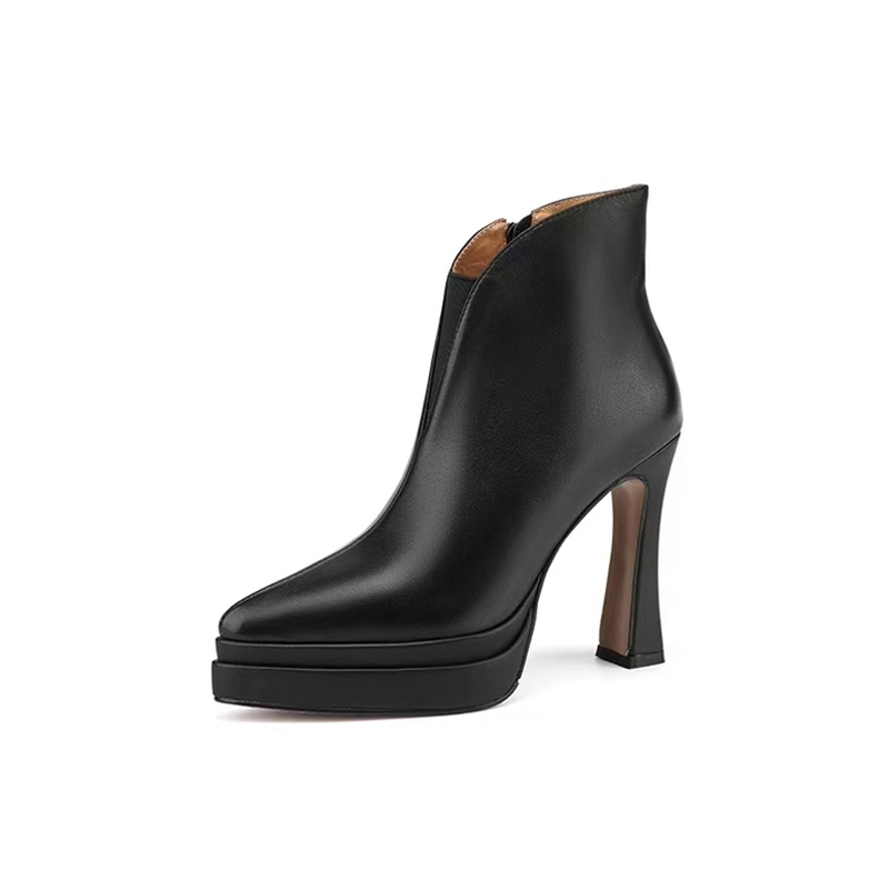 软皮超高跟尖头短靴女2025年秋冬新款防水台侧拉链粗跟百搭高跟鞋