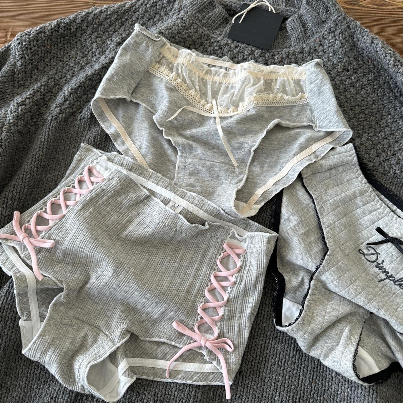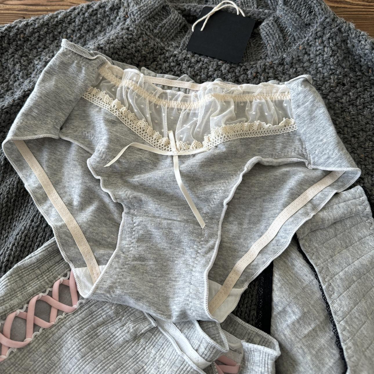 格雷文艺灰/复古低饱和度芭蕾风交叉带子高腰内裤蕾丝拼接三角裤
