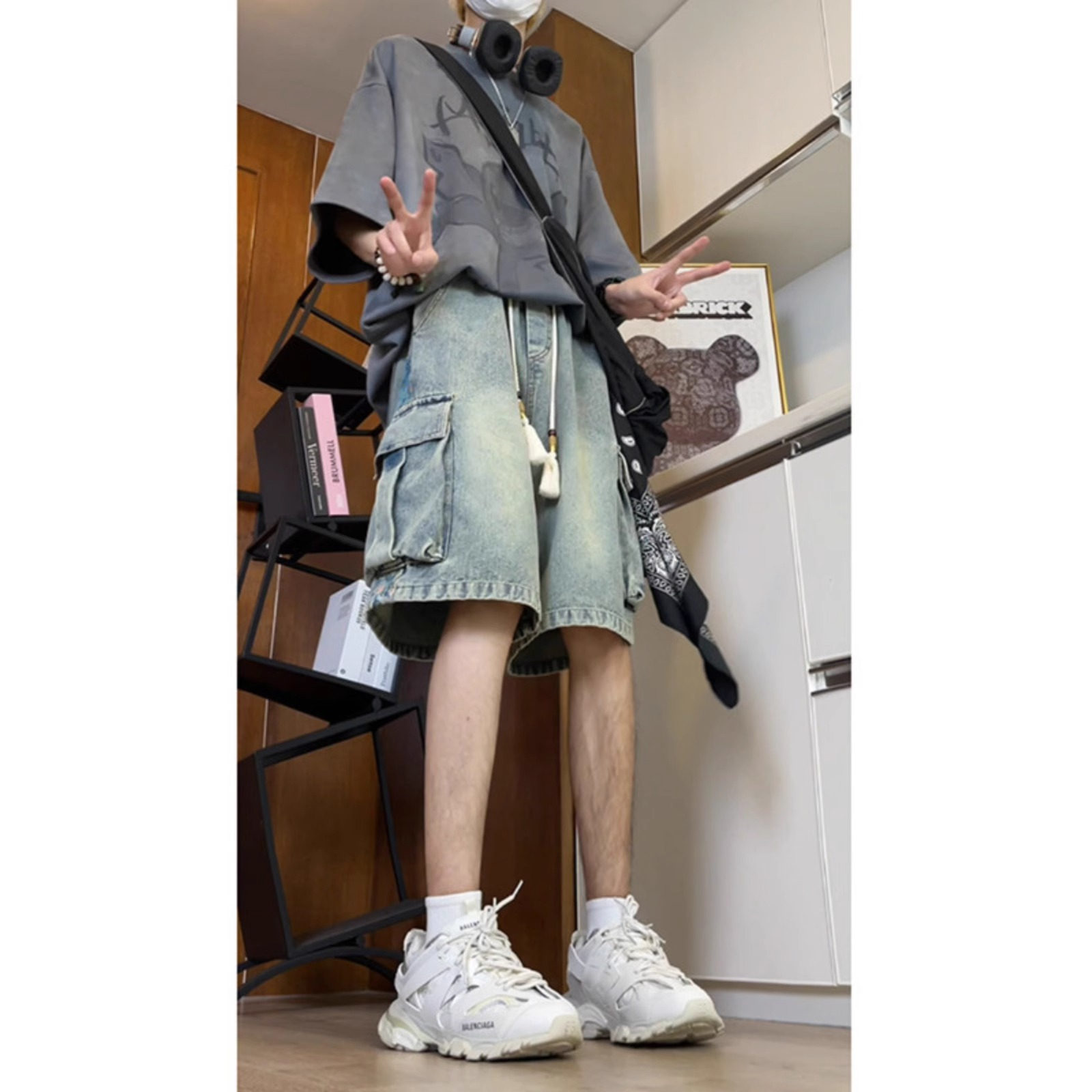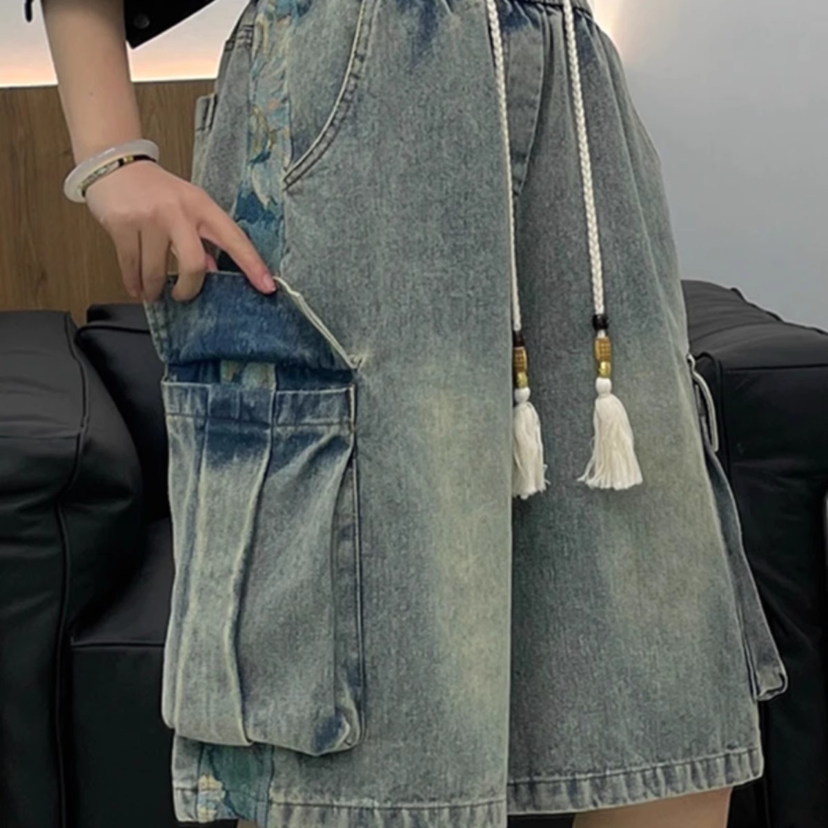新中式国风牛仔短裤男款夏季多口袋工装休闲裤宽松大码运动五分裤