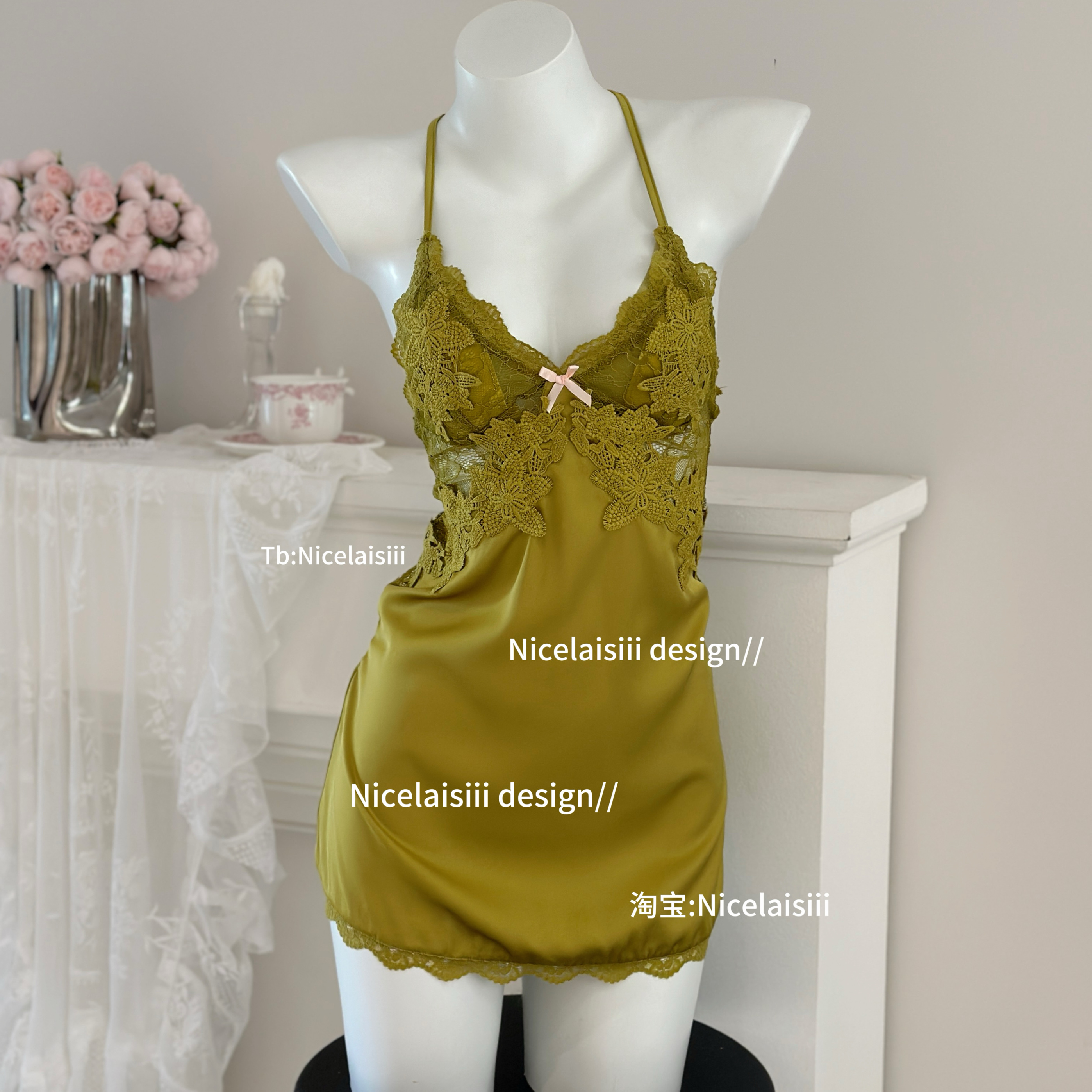 Nicelaisiii伊甸园 纯欲蕾丝睡裙女夏法式v领带胸垫甜美性感睡衣