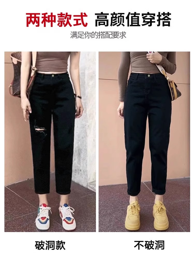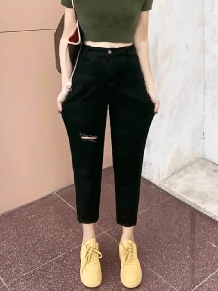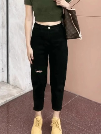 黑色高腰破洞八分小个子萝卜裤