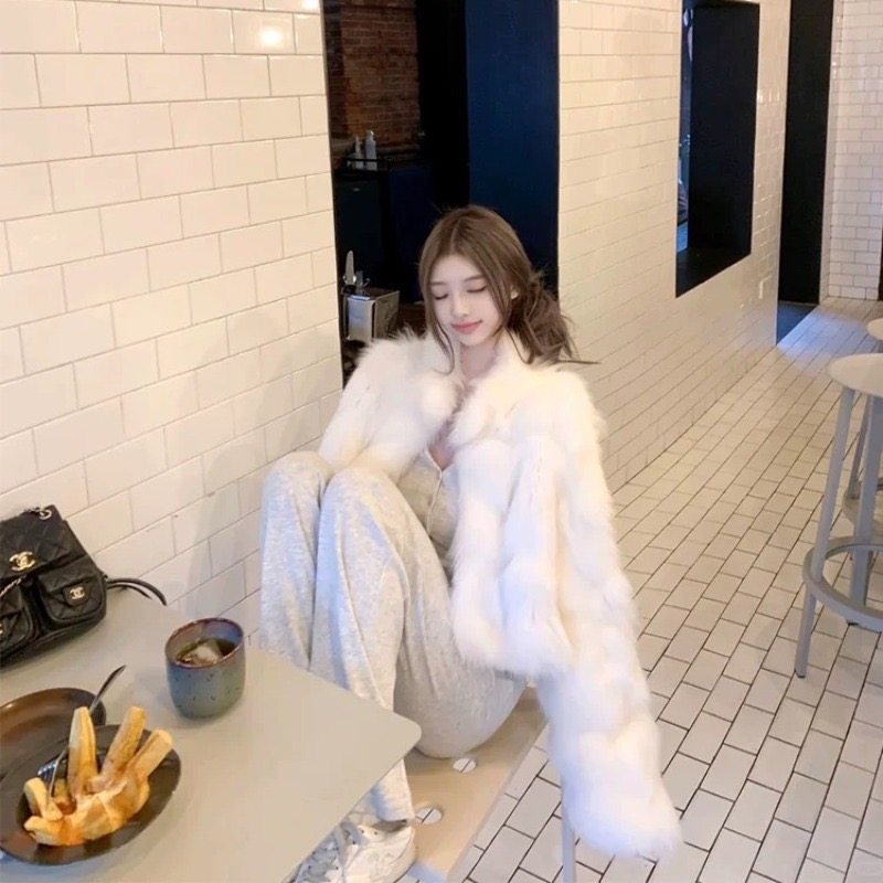 名媛高级感白色狐狸毛保暖毛绒上衣短款外套高腰显瘦套阔腿裤套装