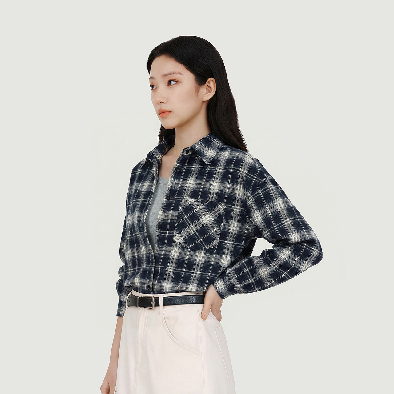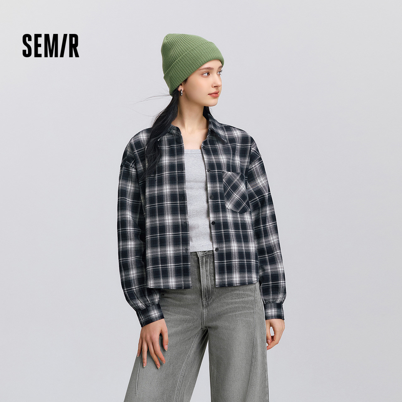 [商场同款]森马长袖衬衫女短背心宽松格纹衬衣2025新款春季两件套
