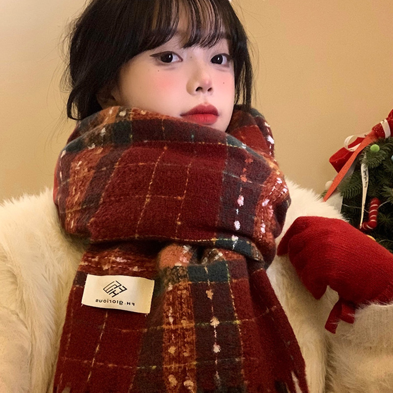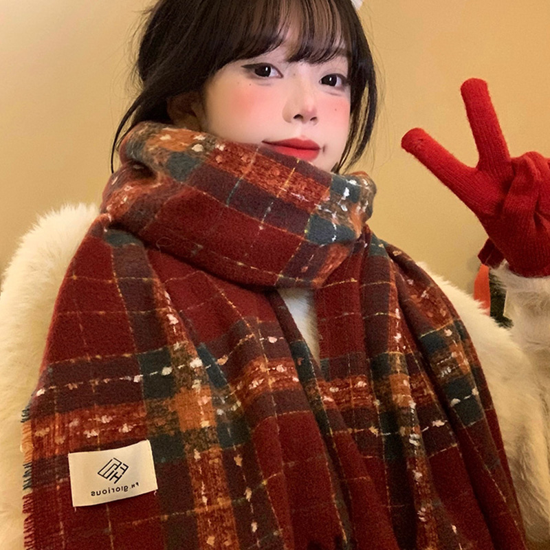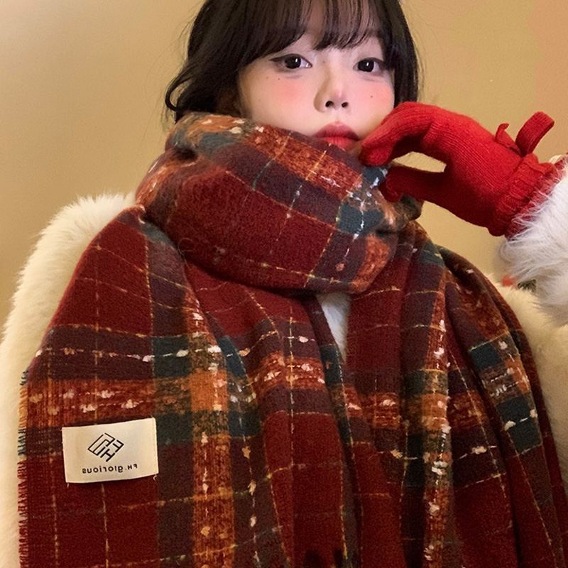 红色格子流苏围巾女冬季韩系氛围感加厚保暖新年圣诞围脖学生披肩