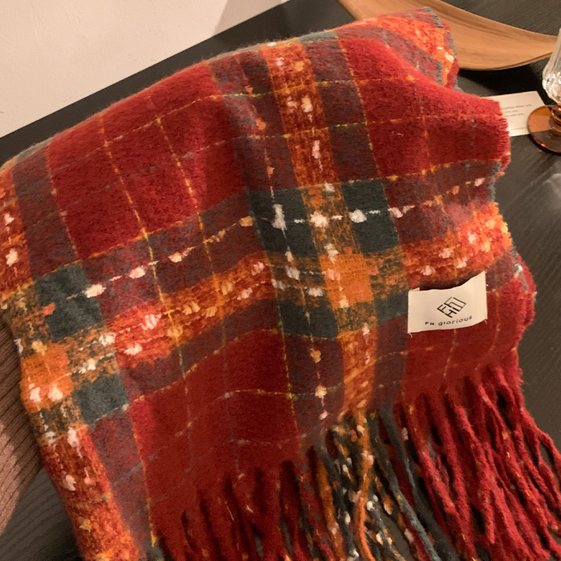 红色格子流苏围巾女冬季
