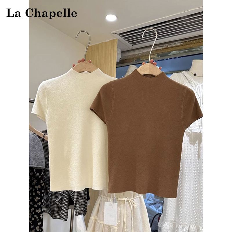 拉夏贝尔半高领针织打底衫女早秋新款内搭高级感气质辣妹短袖上衣