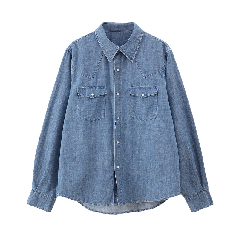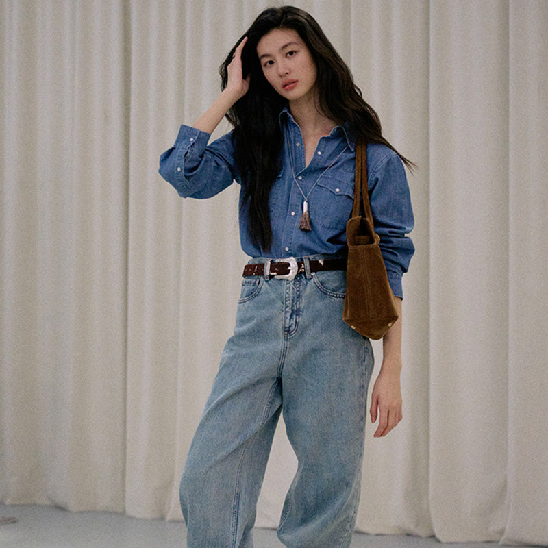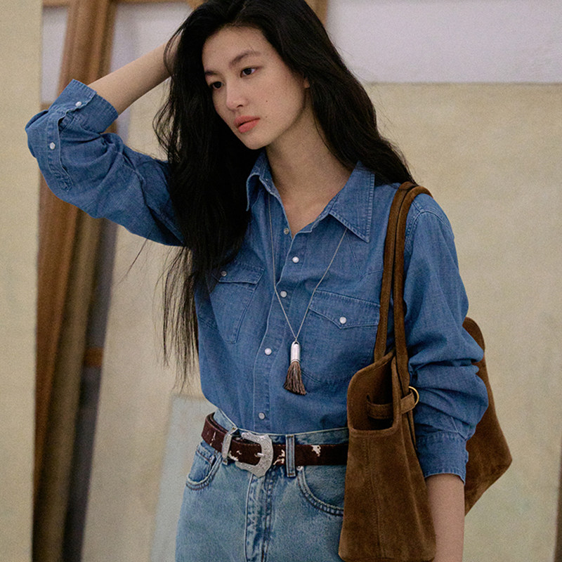 Jicouture竹节棉柔软经典牛仔衬衫女秋季复古单排扣简约通勤上衣