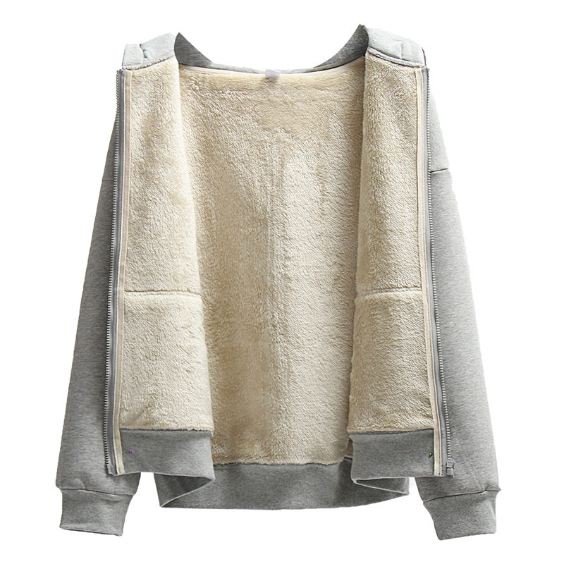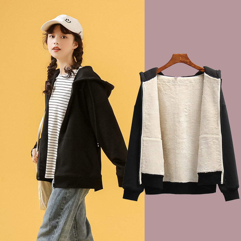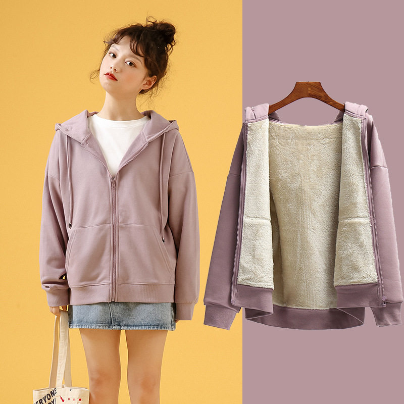 开衫拉链羊羔绒卫衣女秋冬韩版加厚连帽衫原宿风宽松学生外套薄款