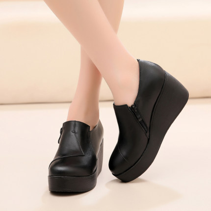真皮深口单鞋春秋季坡跟拉链厚底