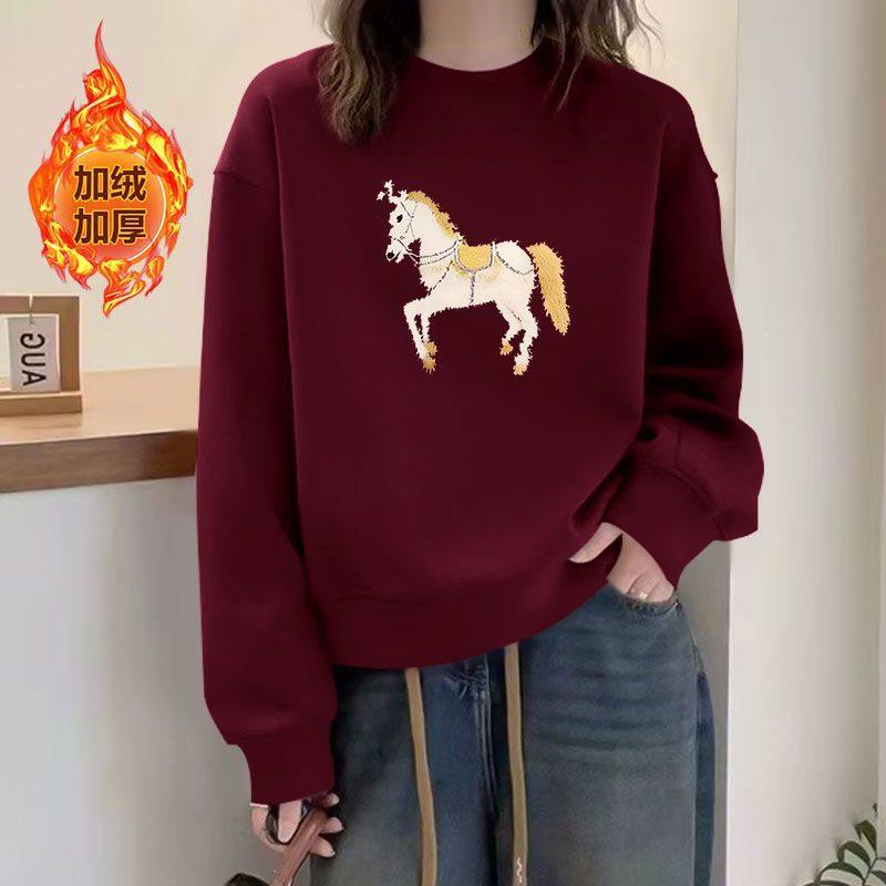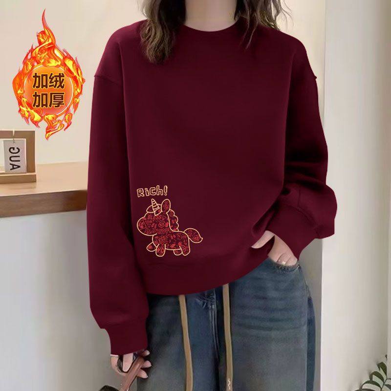纯棉酒红色加绒加厚短款新年卫衣女秋冬新款韩版洋气百搭马年衣服