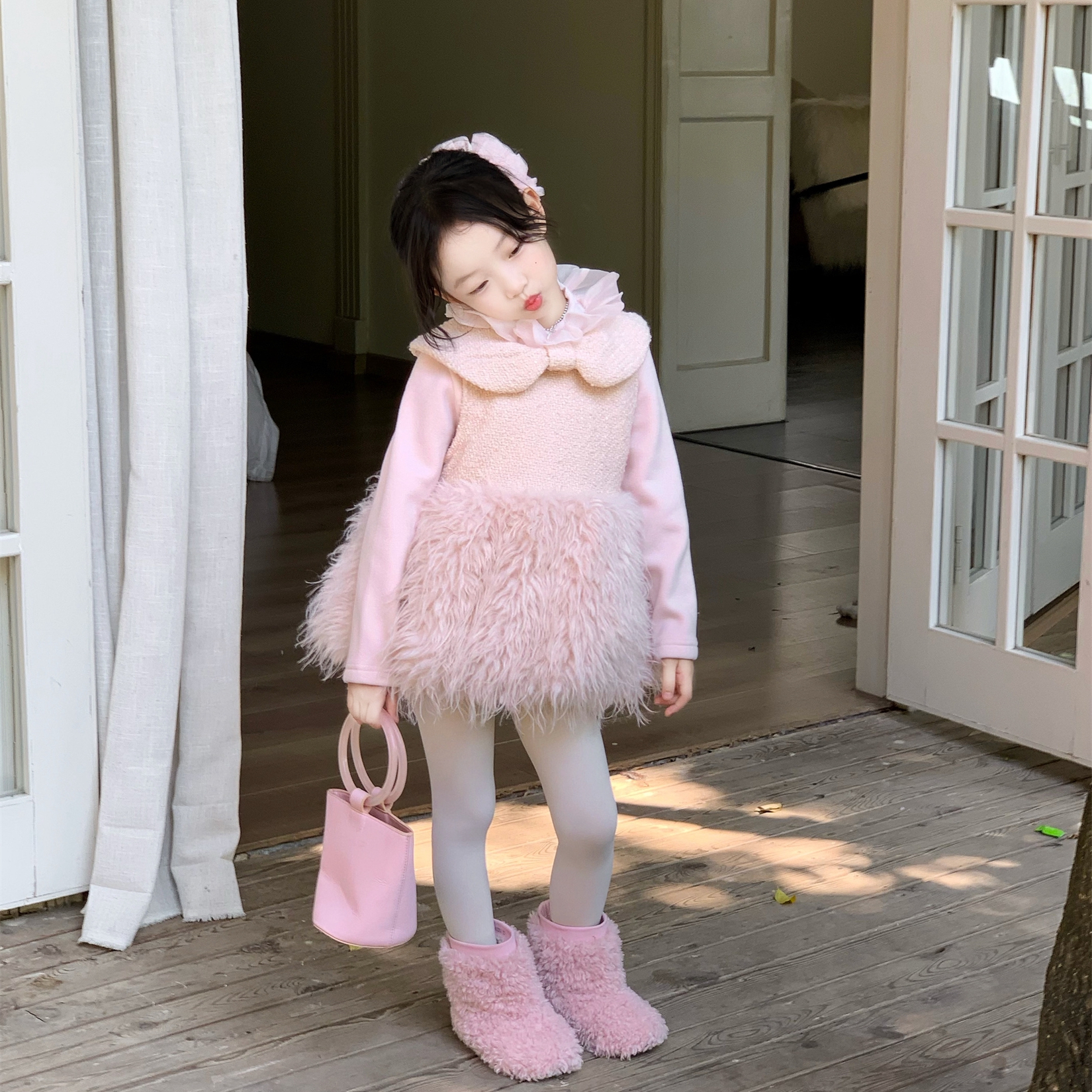 女童粉色毛绒连衣裙秋冬新款儿童洋气蛋糕公主裙小童背心礼服裙