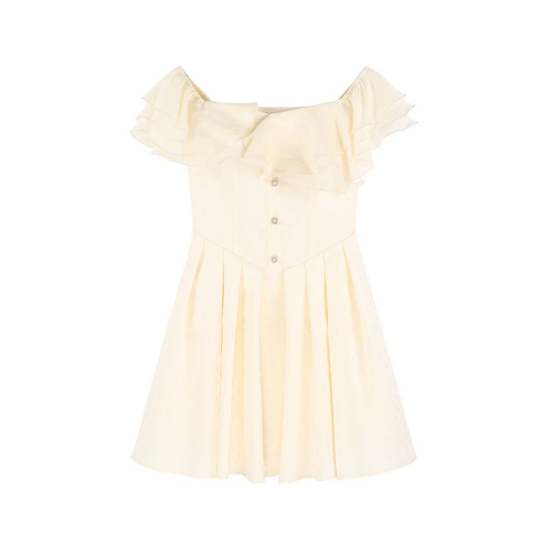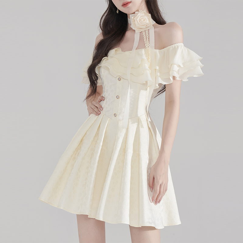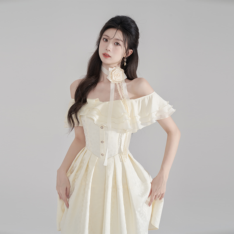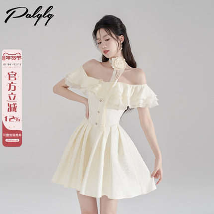一字肩荷叶边白色连衣裙女夏季高级感收腰露肩a字裙甜美公主裙子