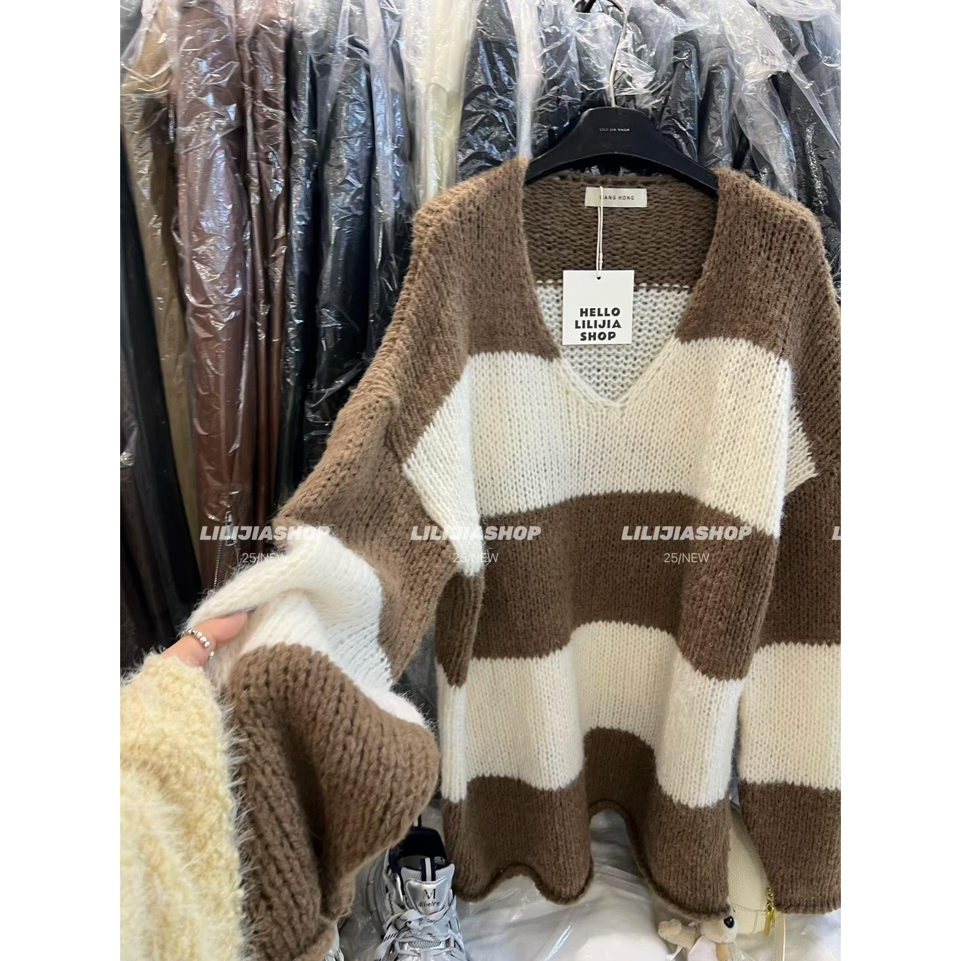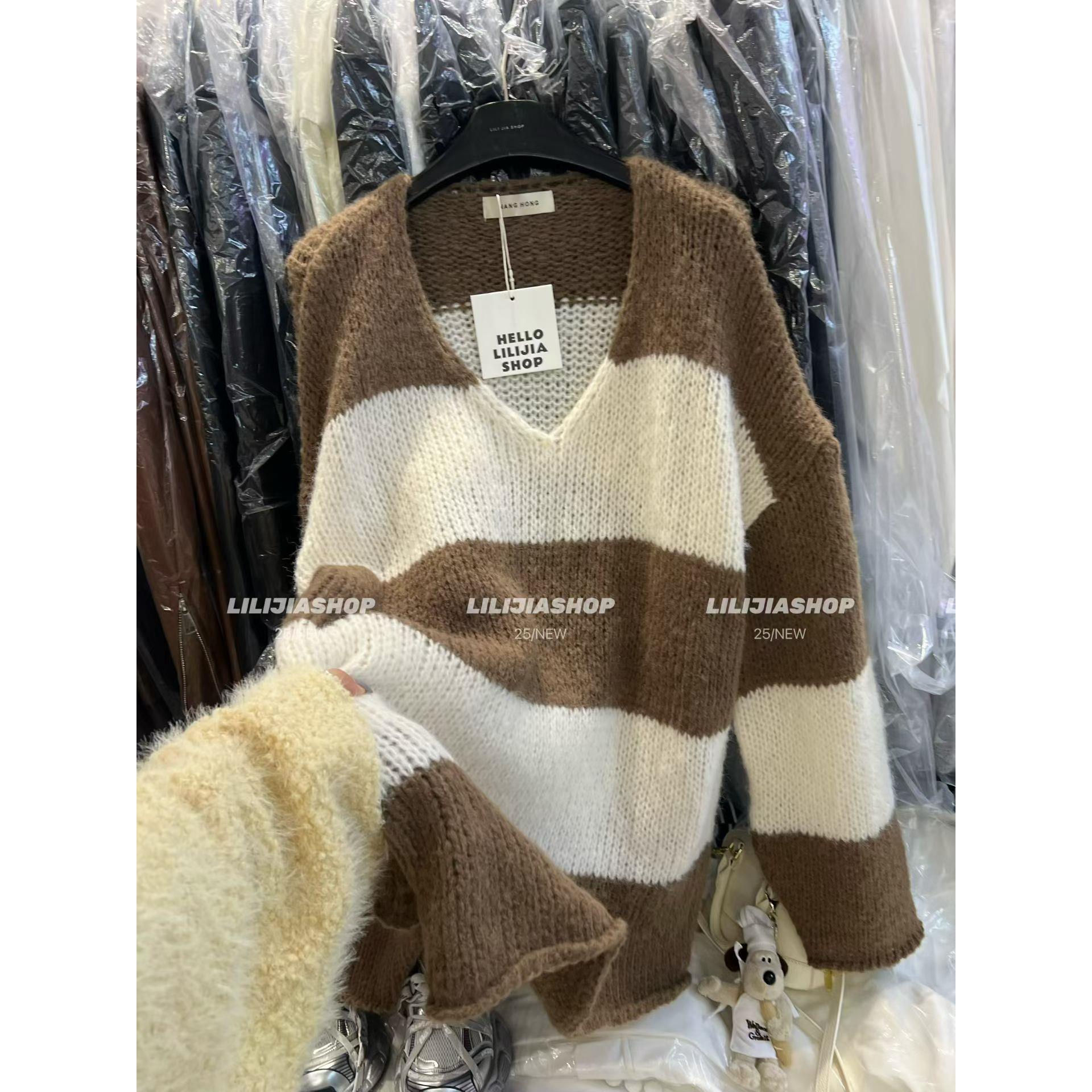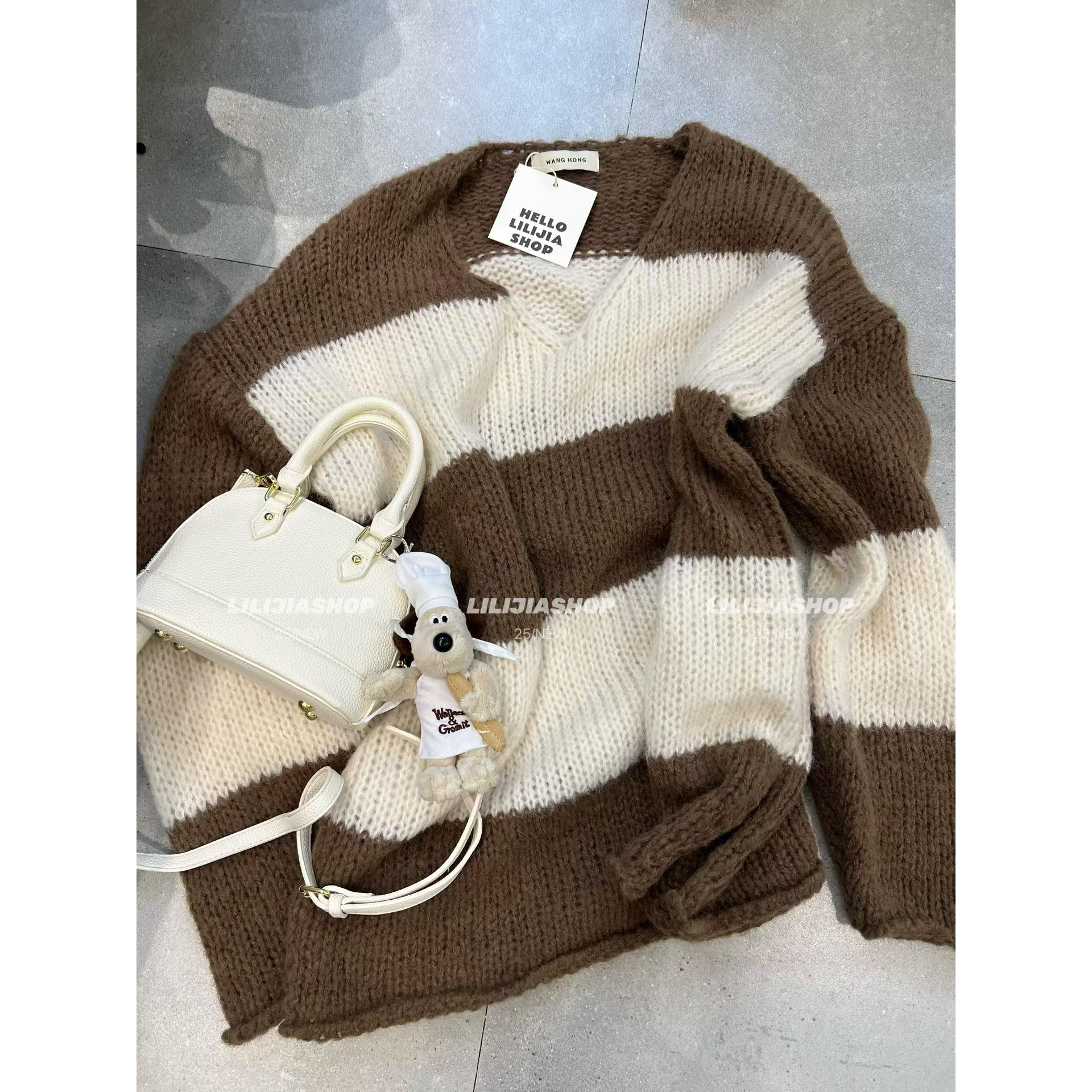 2025新款宽松V领套头毛衣女条纹学院风马海毛中长款遮屁股针织衫