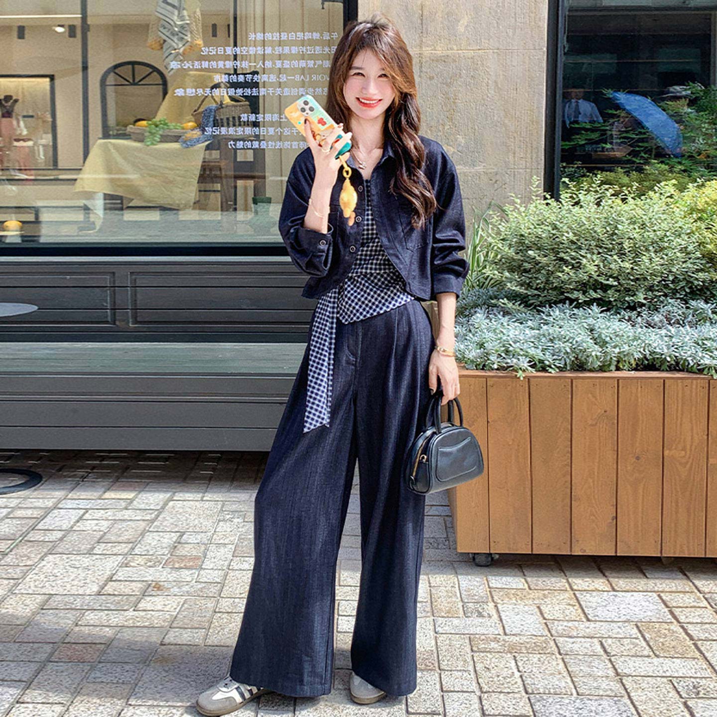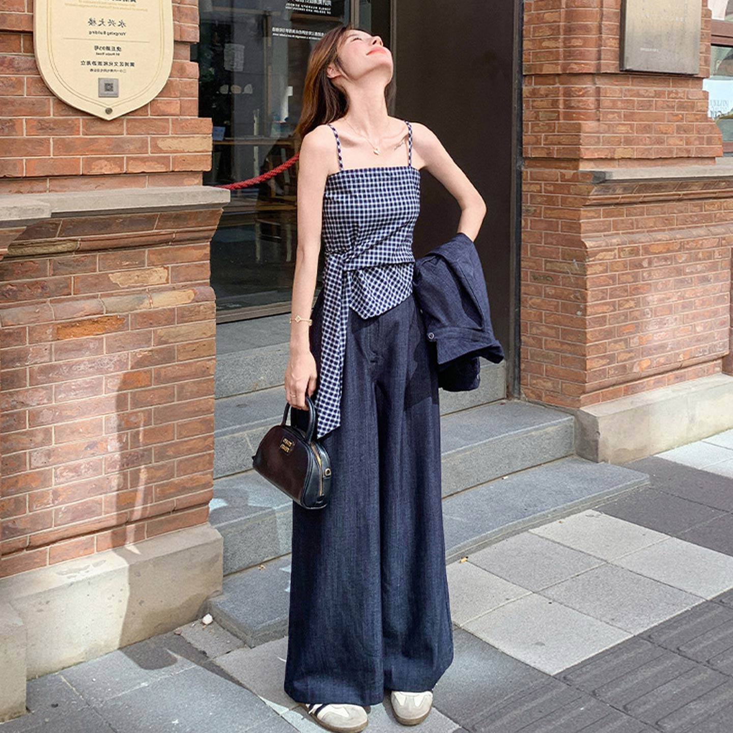气质女神范高端套装女装2025新款秋季三件套外套吊带长裤牛仔套装