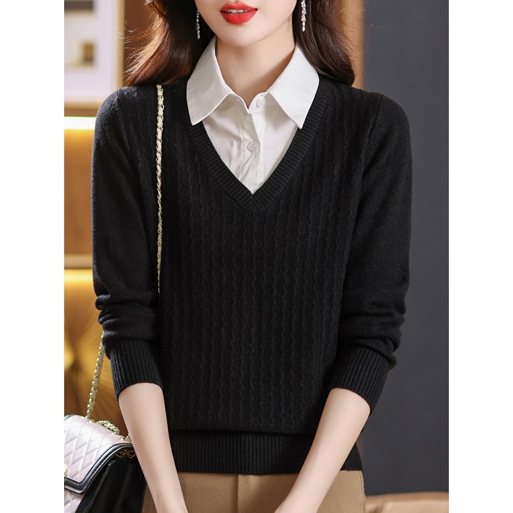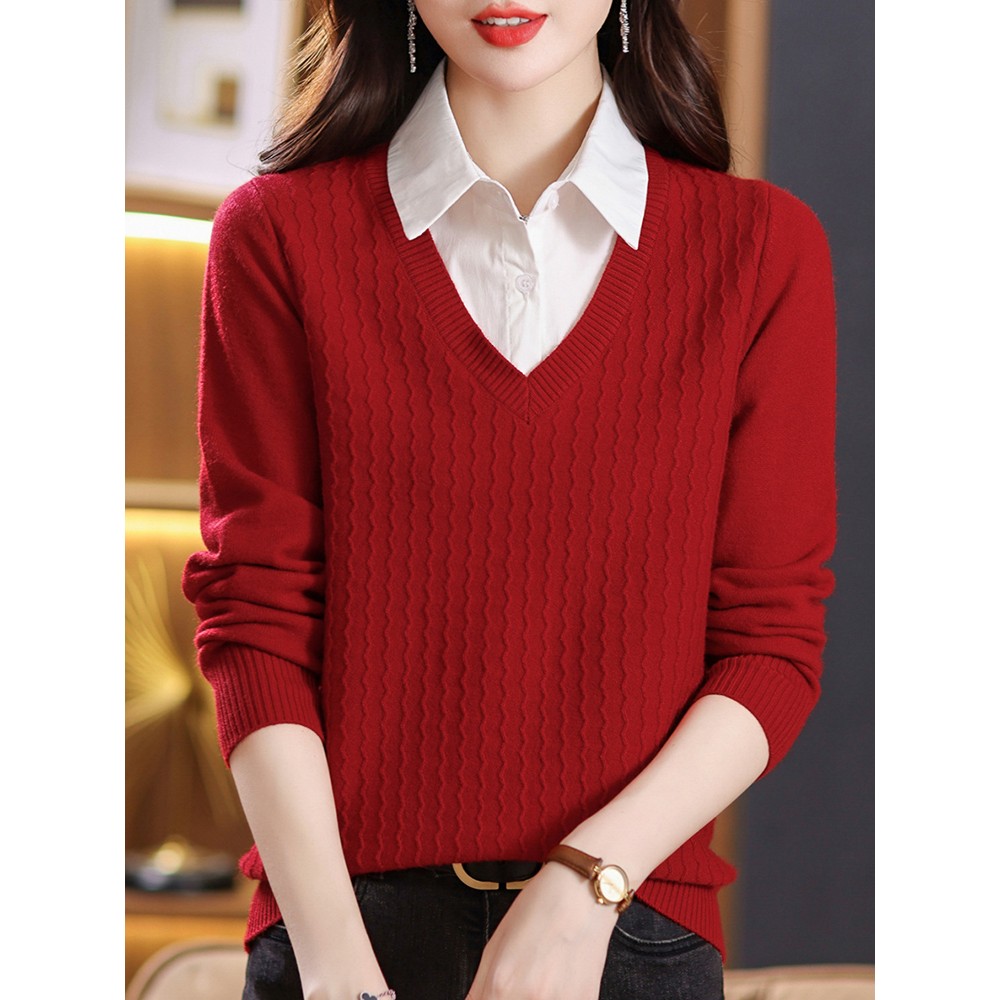 春装新款假两件上衣女时尚洋气宽松衬衫领拼接毛衣针织打底衫春秋