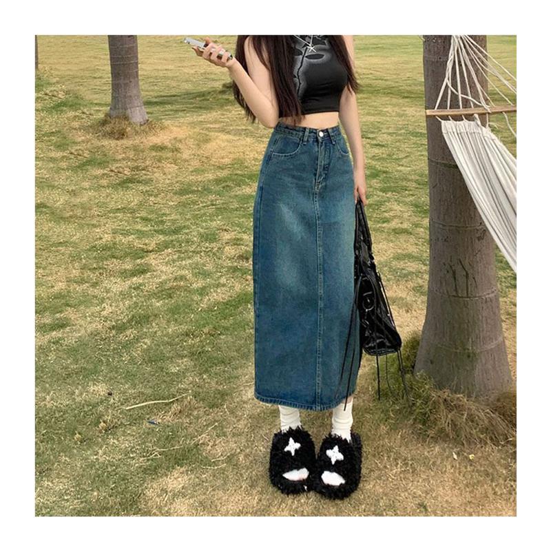 黑灰色高腰开叉牛仔半身裙女a字夏季2025年新款小个子遮胯显瘦裙