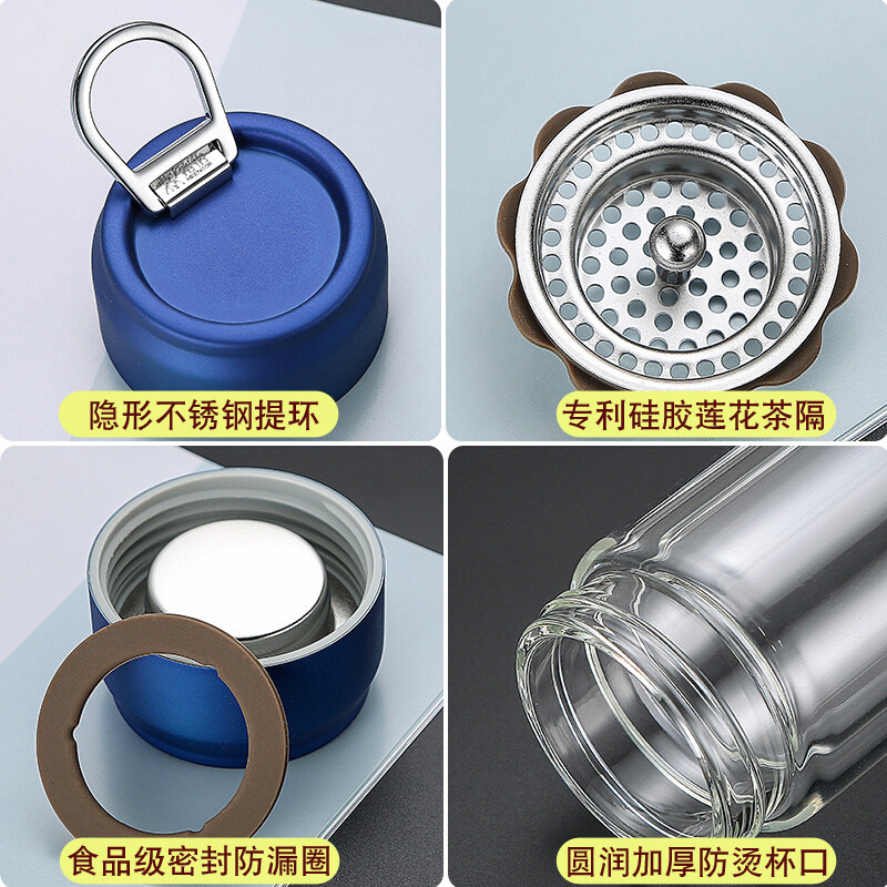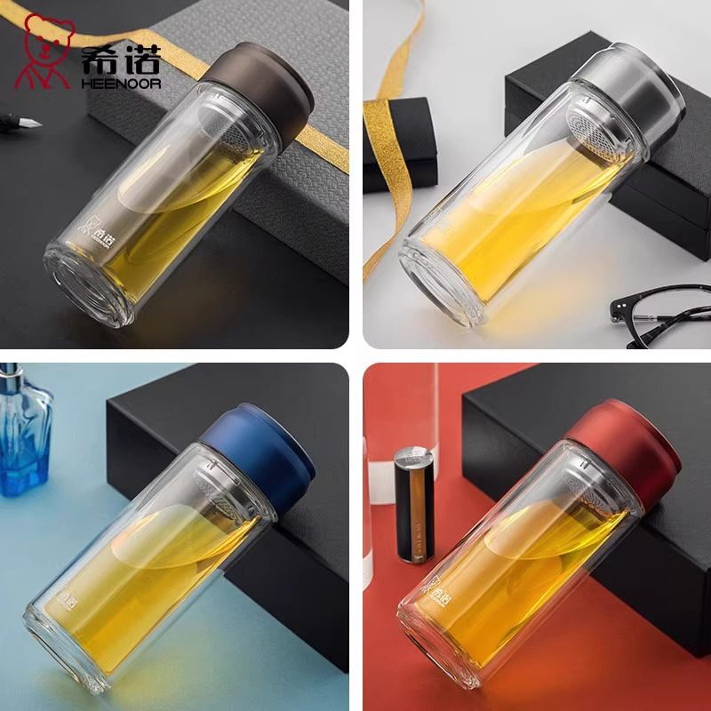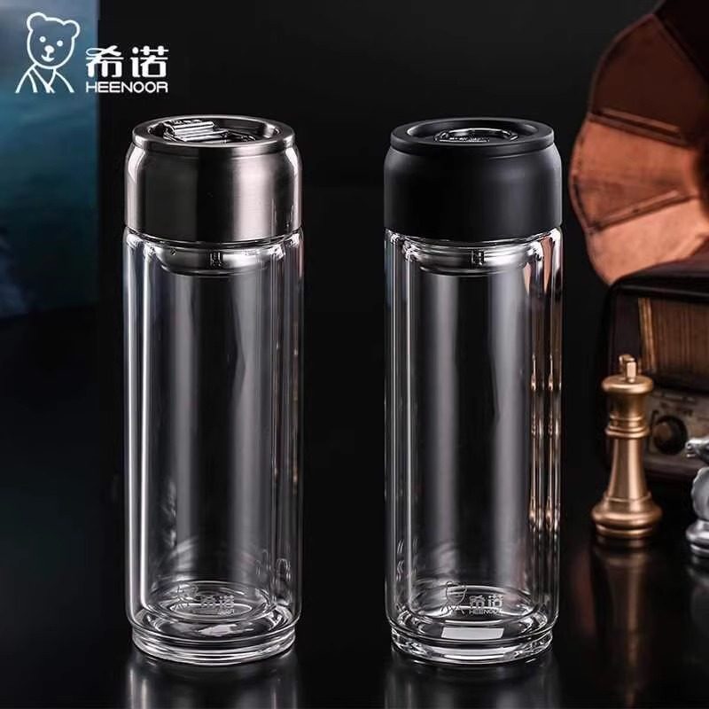 希诺玻璃杯双层男女士办公泡茶杯子便携提手透明加厚水晶车载水杯
