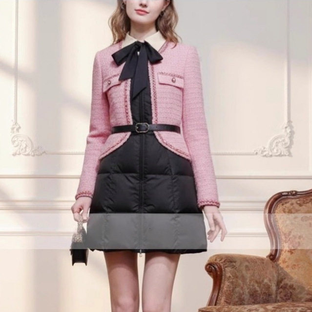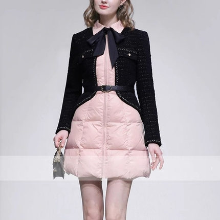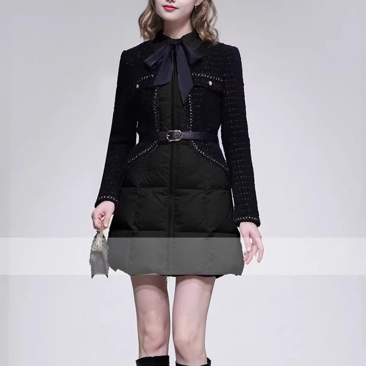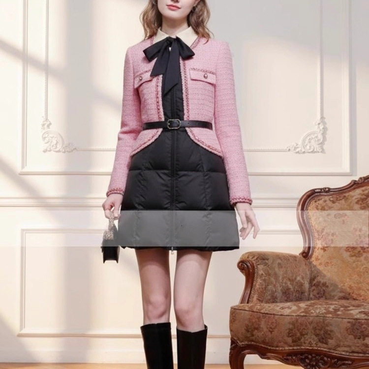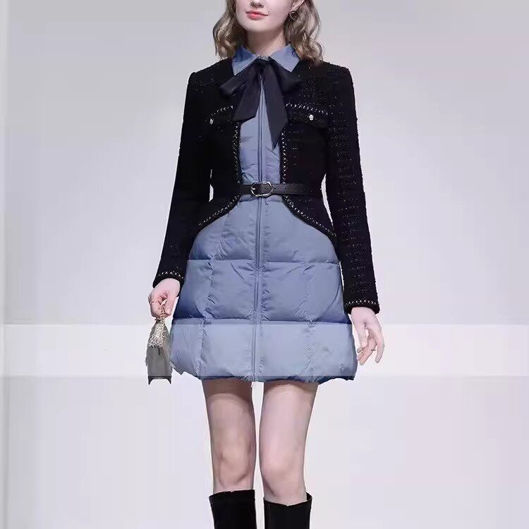 冬新款假两件小香轻奢粗花呢拼接翻领收腰显瘦A摆羽绒服外套