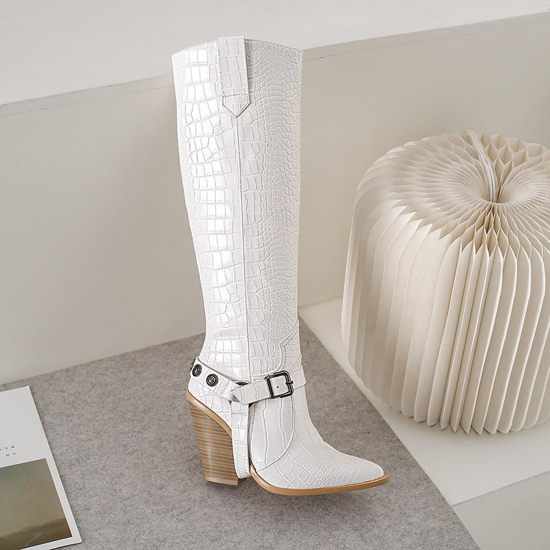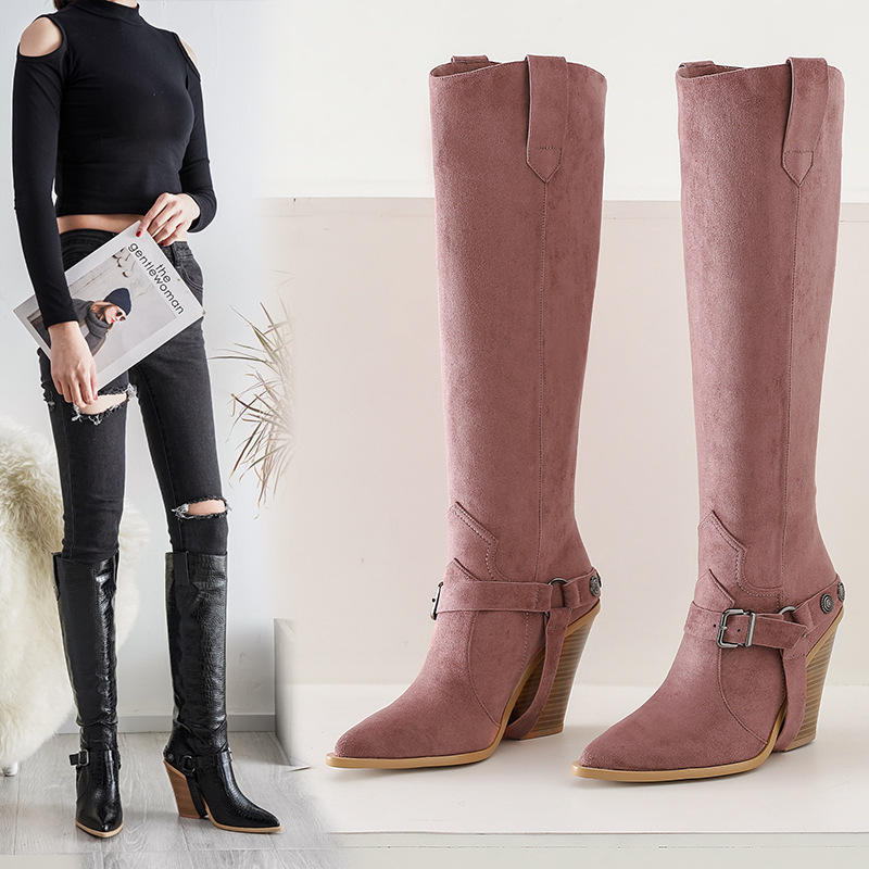 速卖通WISH亚马逊女高筒靴秋冬女鞋尖头异型粗跟懒人套筒大码女靴