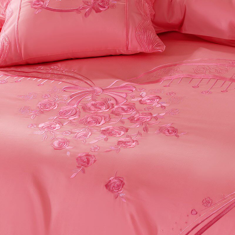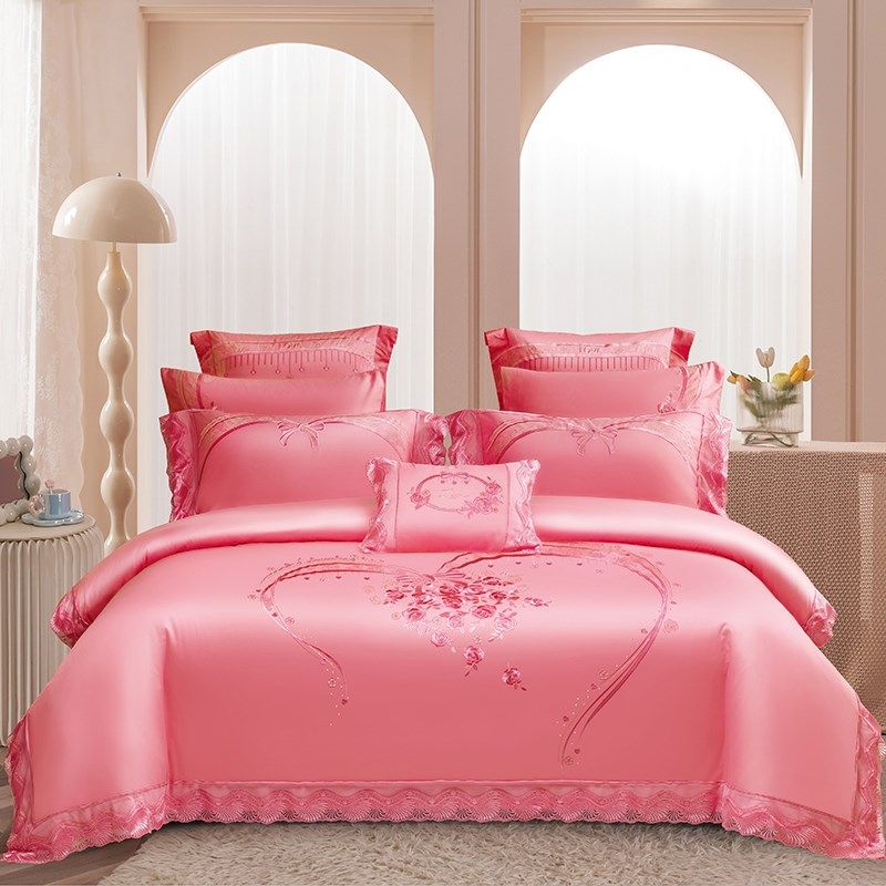 140支全棉婚庆四六件套刺绣蕾丝结婚粉红色被套床单新婚床上用品