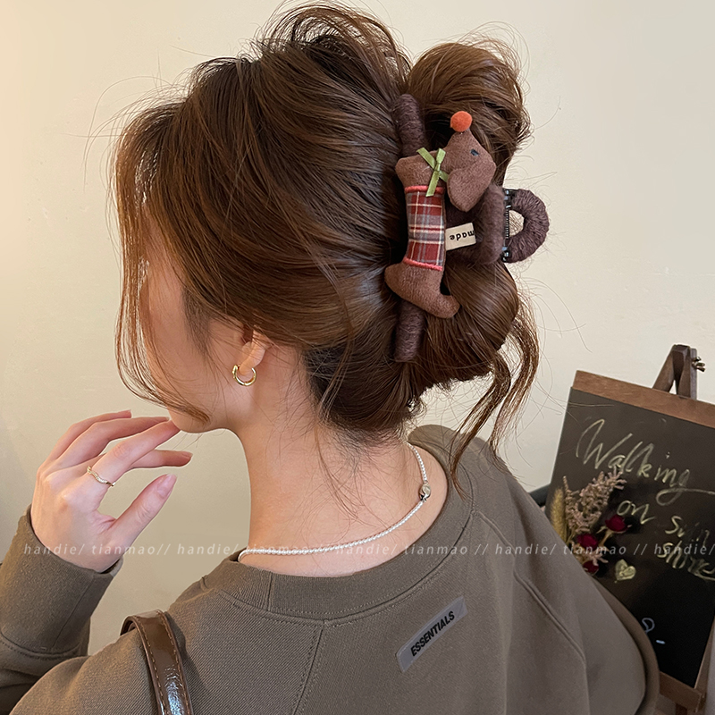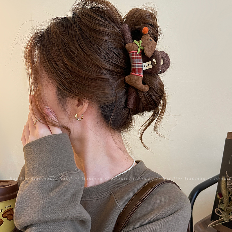 玩偶小狗蝴蝶结发夹女高级感格纹后脑勺抓夹盘发大号鲨鱼夹发饰