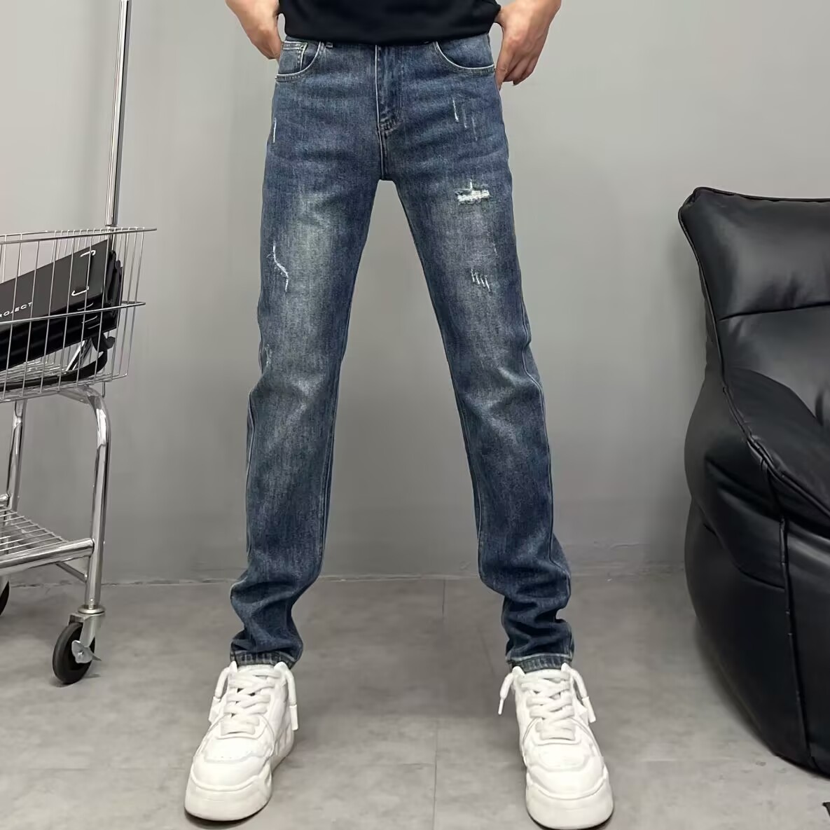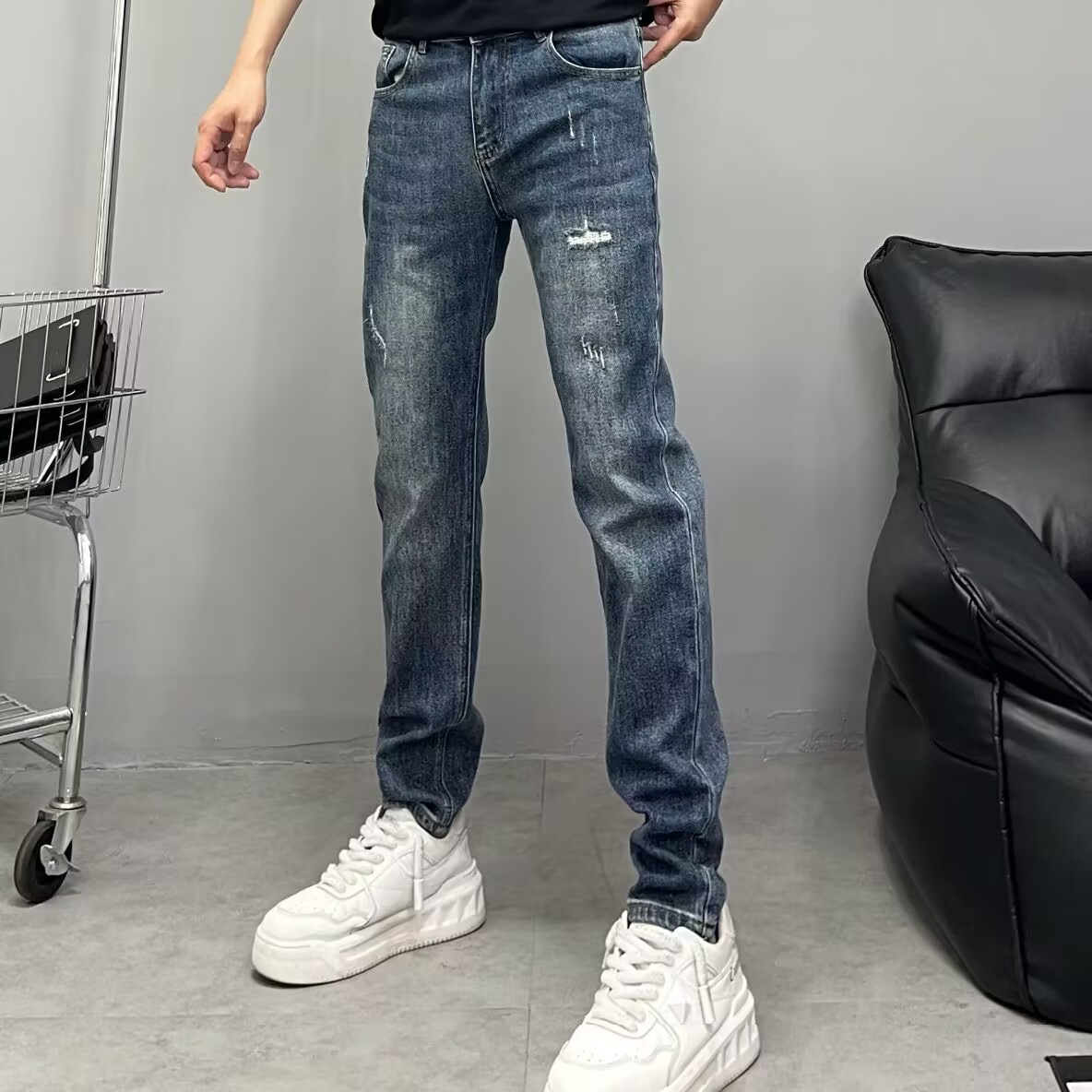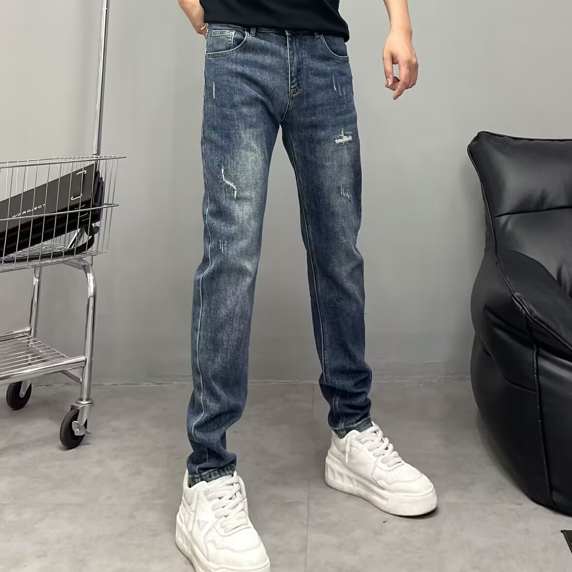 高端复古蓝色牛仔裤男修身小直筒2025秋季新款刮烂弹力小脚长裤潮