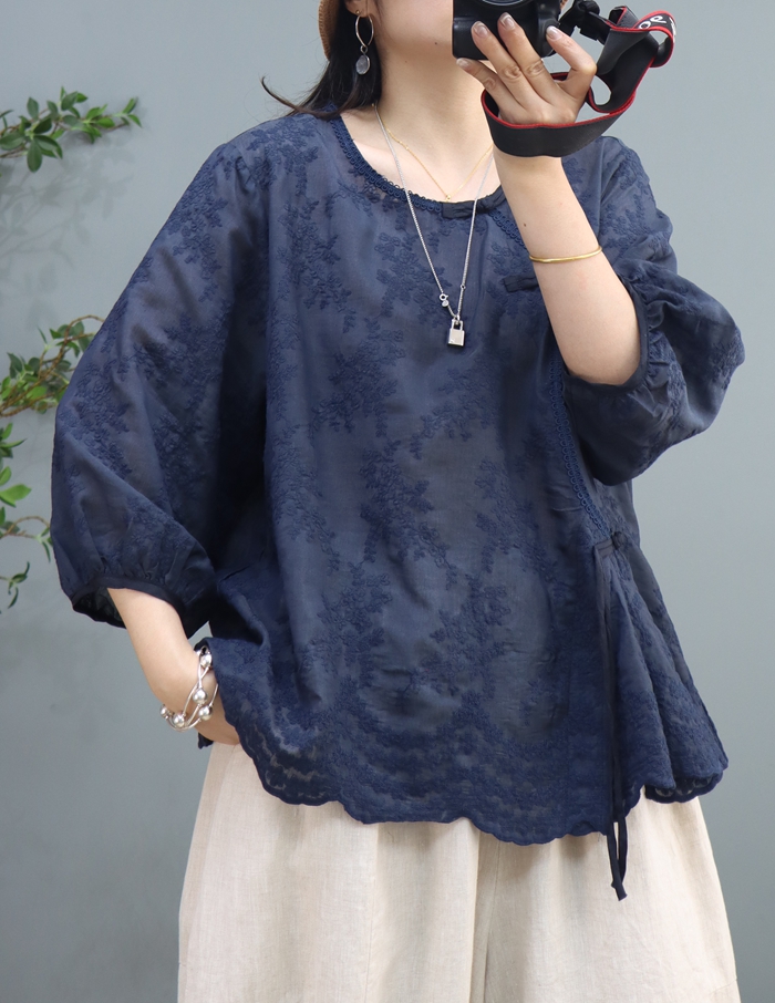 复古文艺苎麻刺绣七分袖套头衬衫