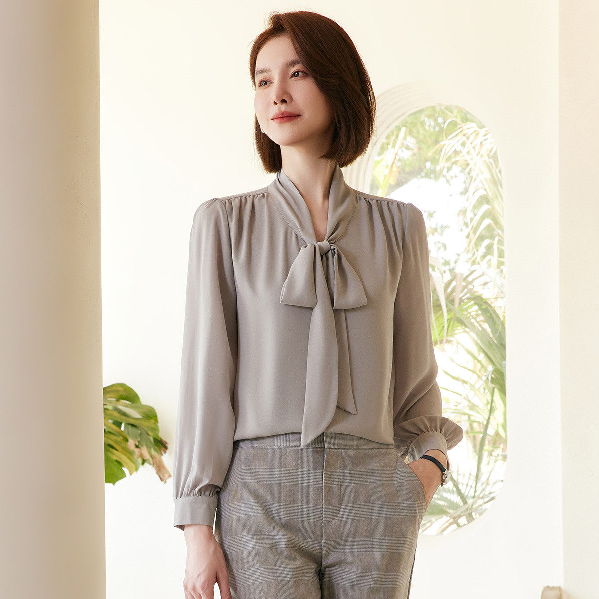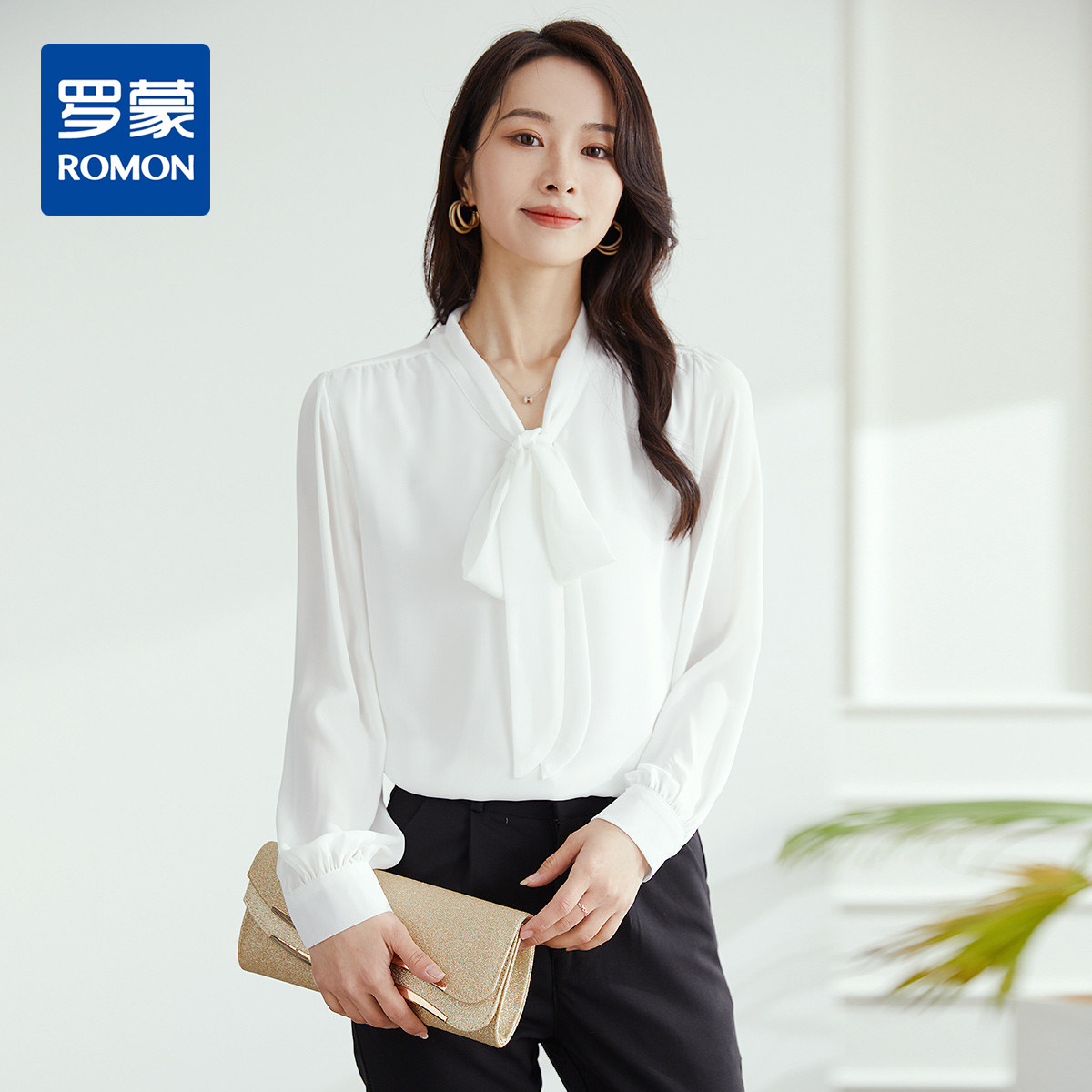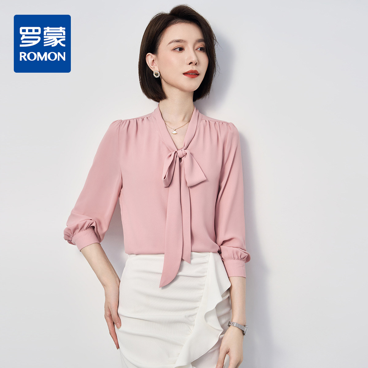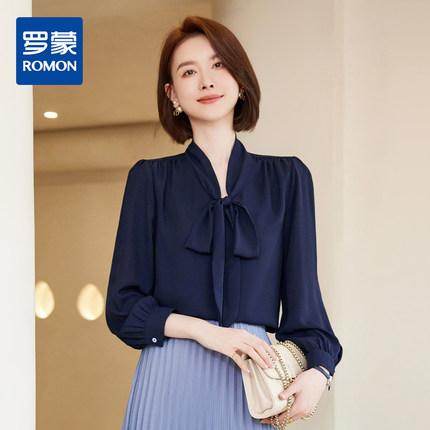 罗蒙衬衫女长袖春秋装纯色雪纺衫蝴蝶结衬衣休闲通勤衬衫女上衣
