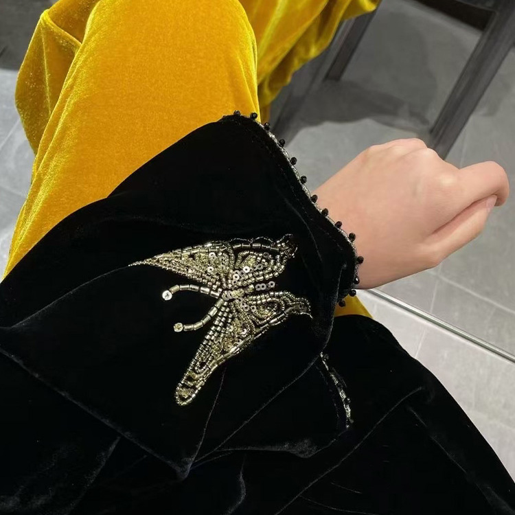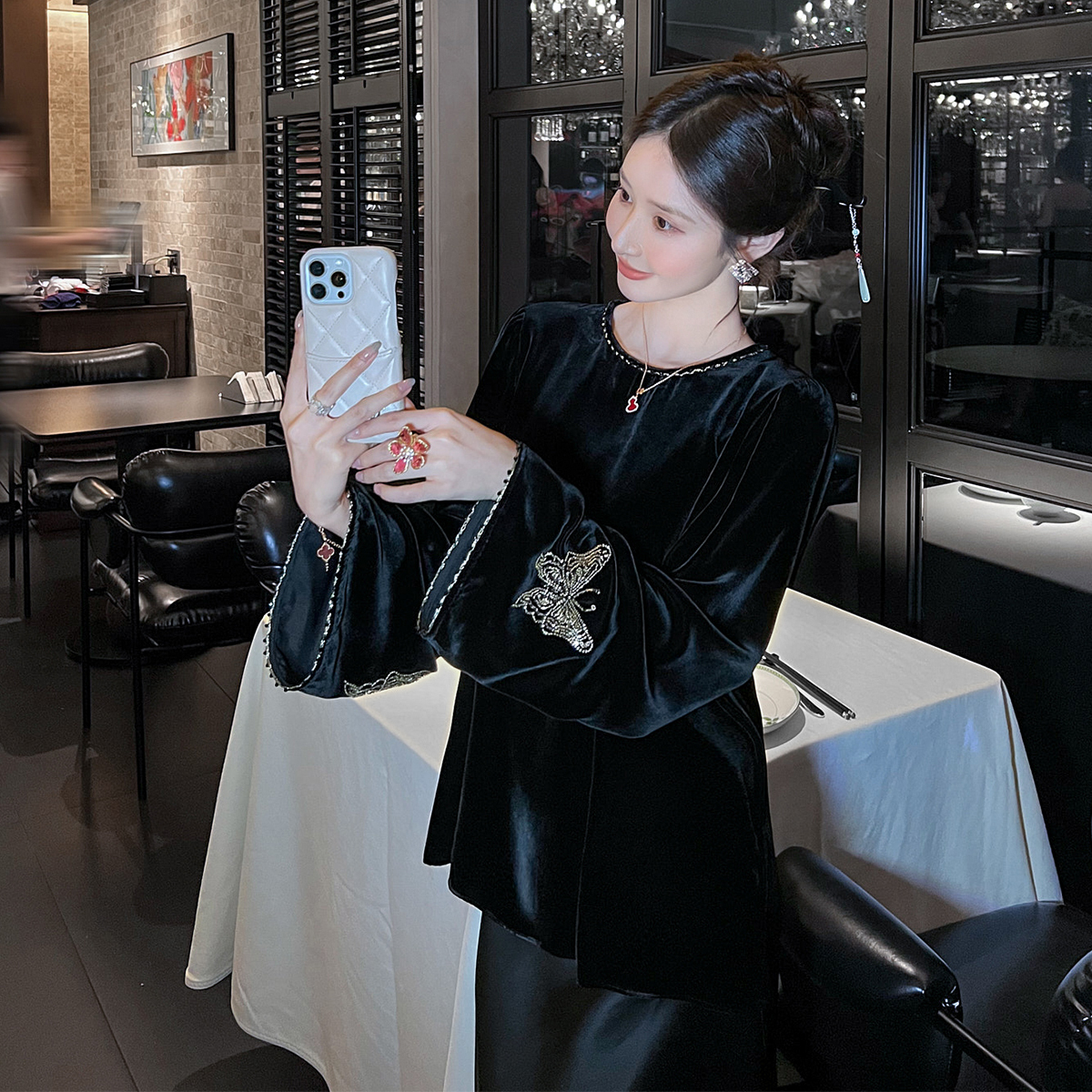 新中式国风丝绒衬衫上衣女2025春秋季新款刺绣钉珠打底长袖T恤衫