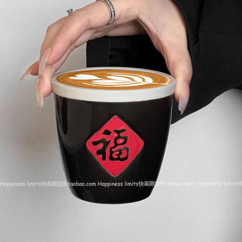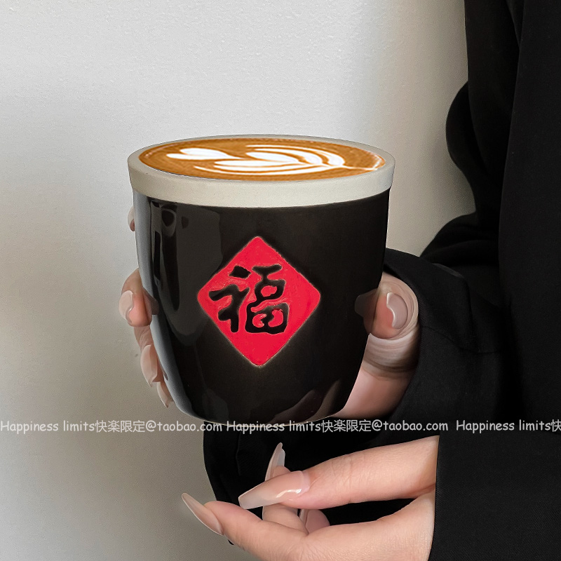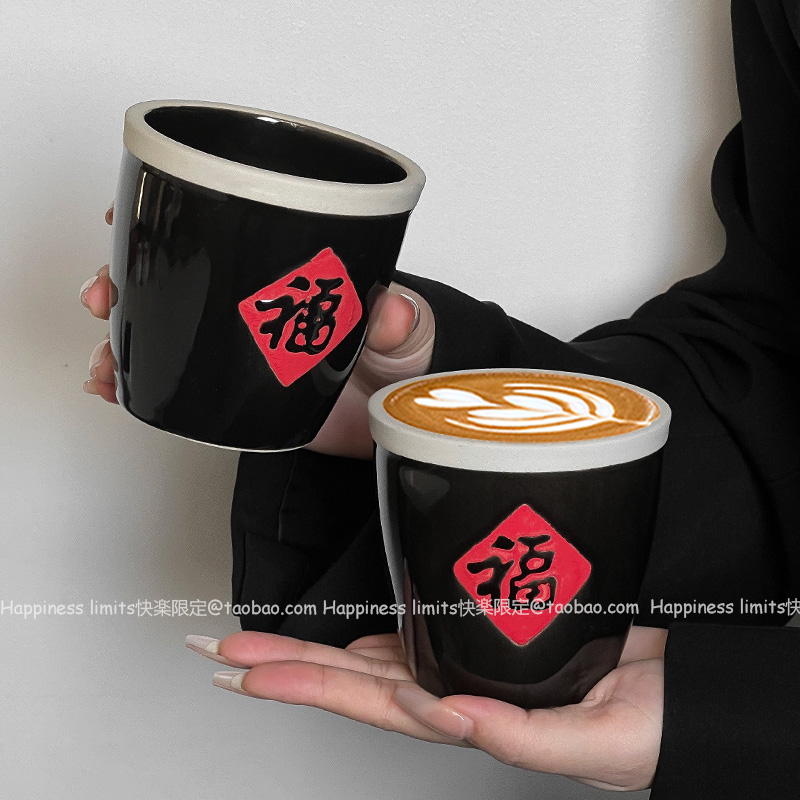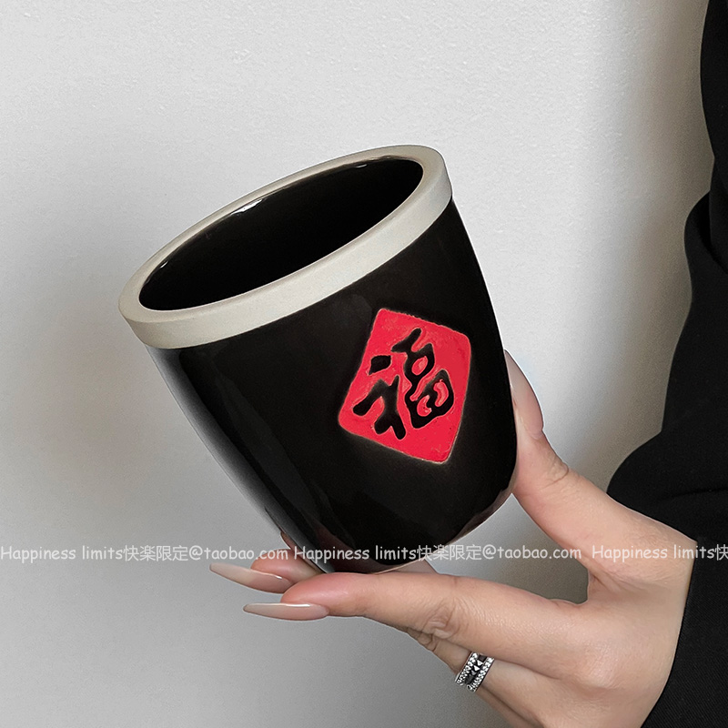复古中式粗陶马克杯个性创意设计福字罐陶瓷拿铁咖啡杯饮品奶茶杯