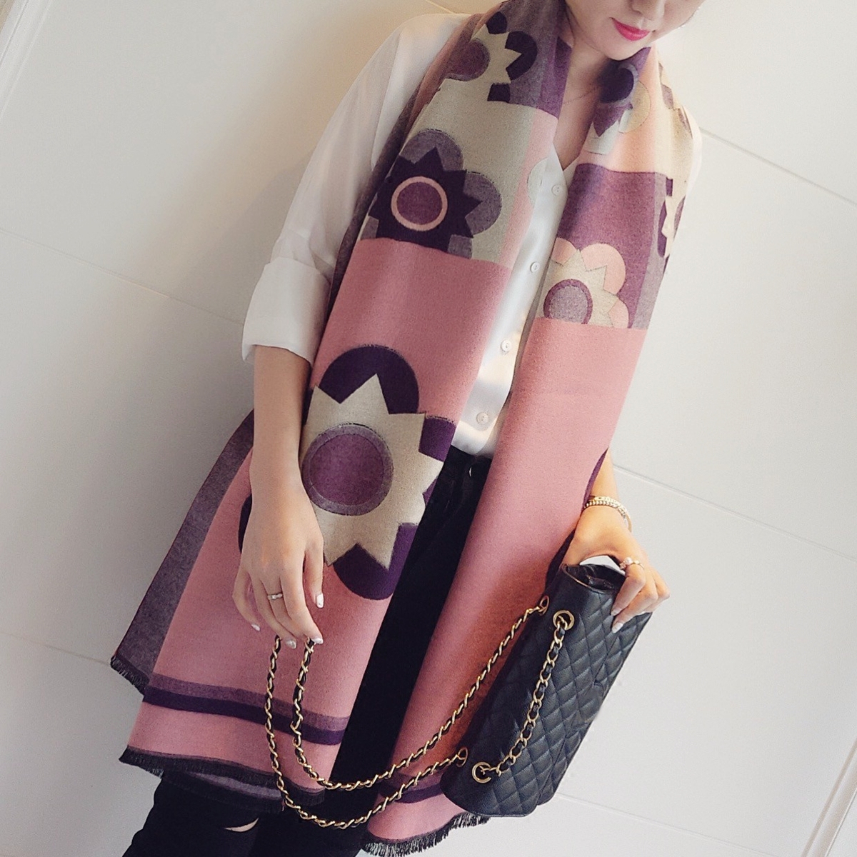 新款韩版太阳花粉色仿羊绒围巾