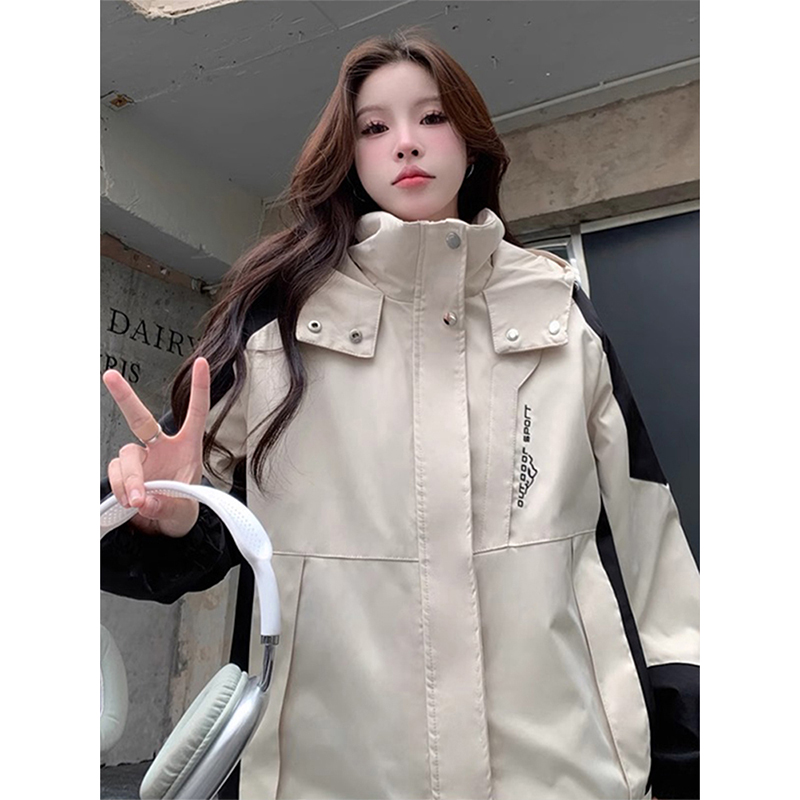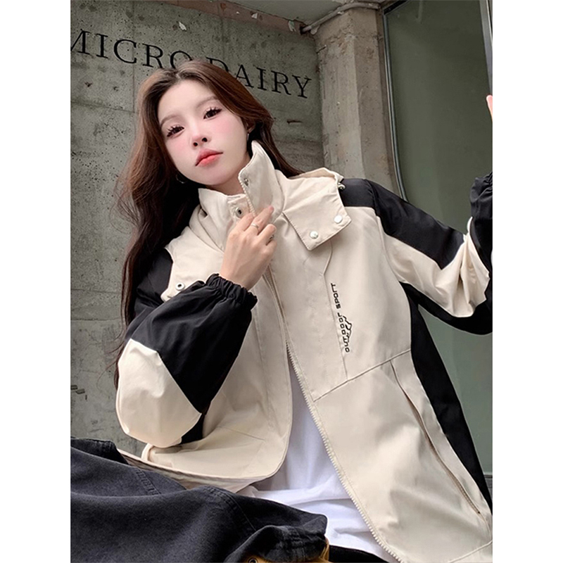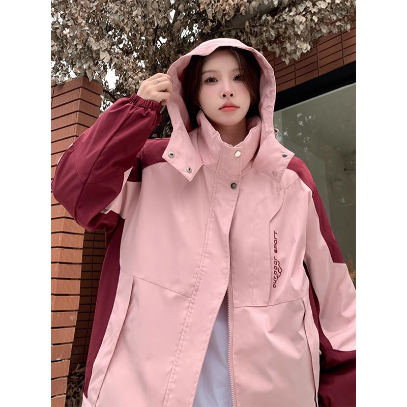 特大码胖mm撞色连帽冲锋衣女秋冬新款ins学生粉色夹棉棉服外套潮
