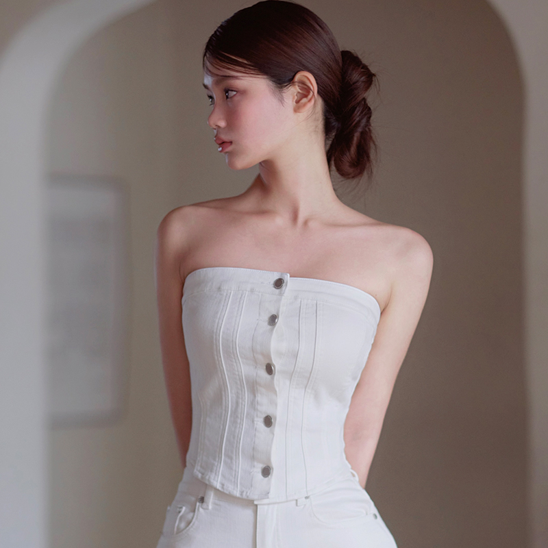 kindame韩国百搭纯色时尚露肩无袖纽扣开衫抹胸TS25S3105