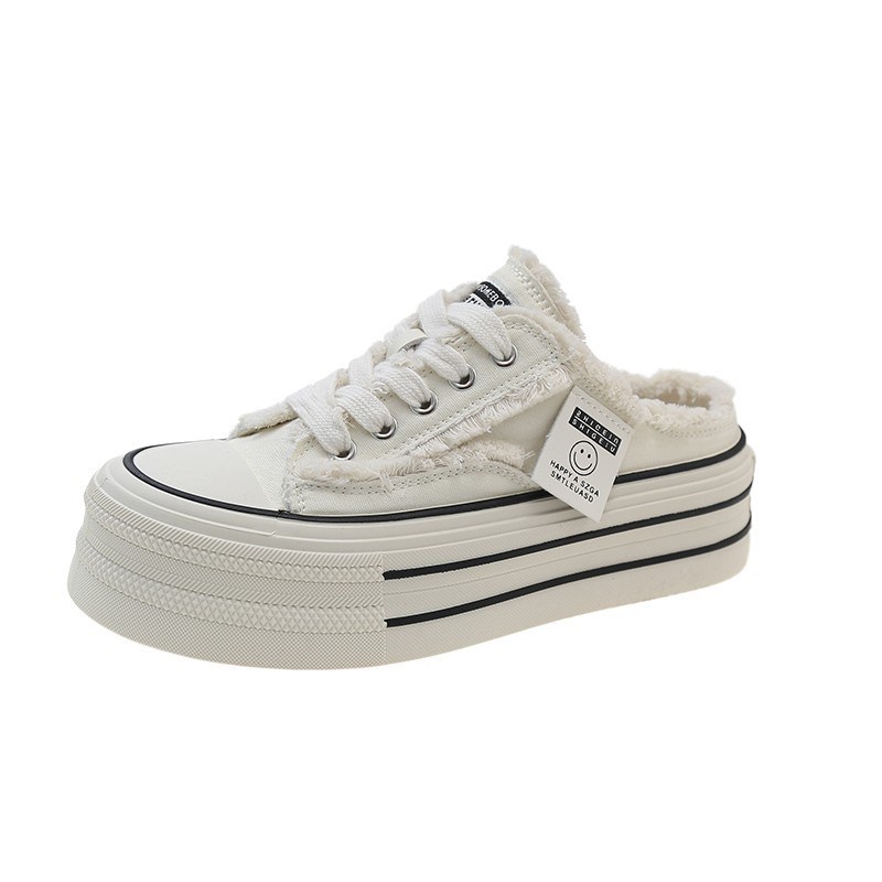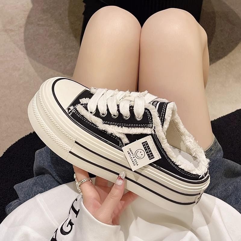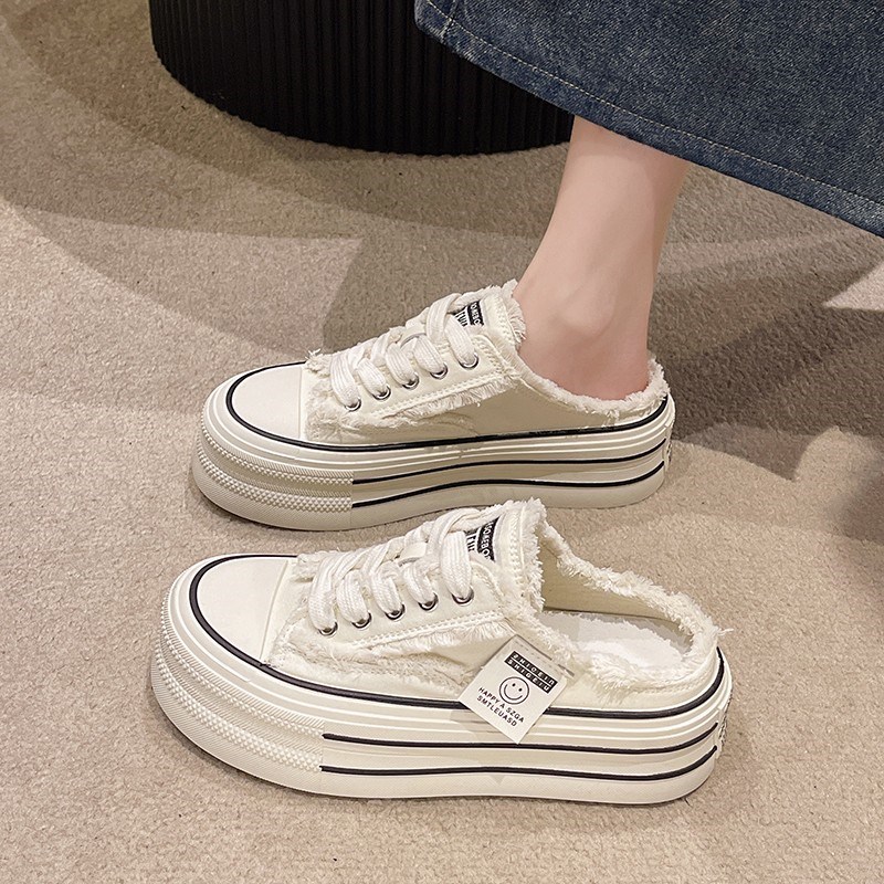 包头半拖a鞋外穿夏女小白鞋2025新款爆款懒人一脚蹬厚底帆布超火