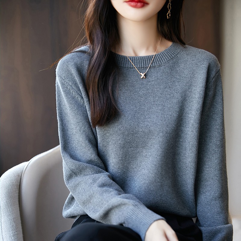秋冬纯棉线加厚长袖针织打底衫女圆领毛衣韩版宽松内搭全棉线上衣