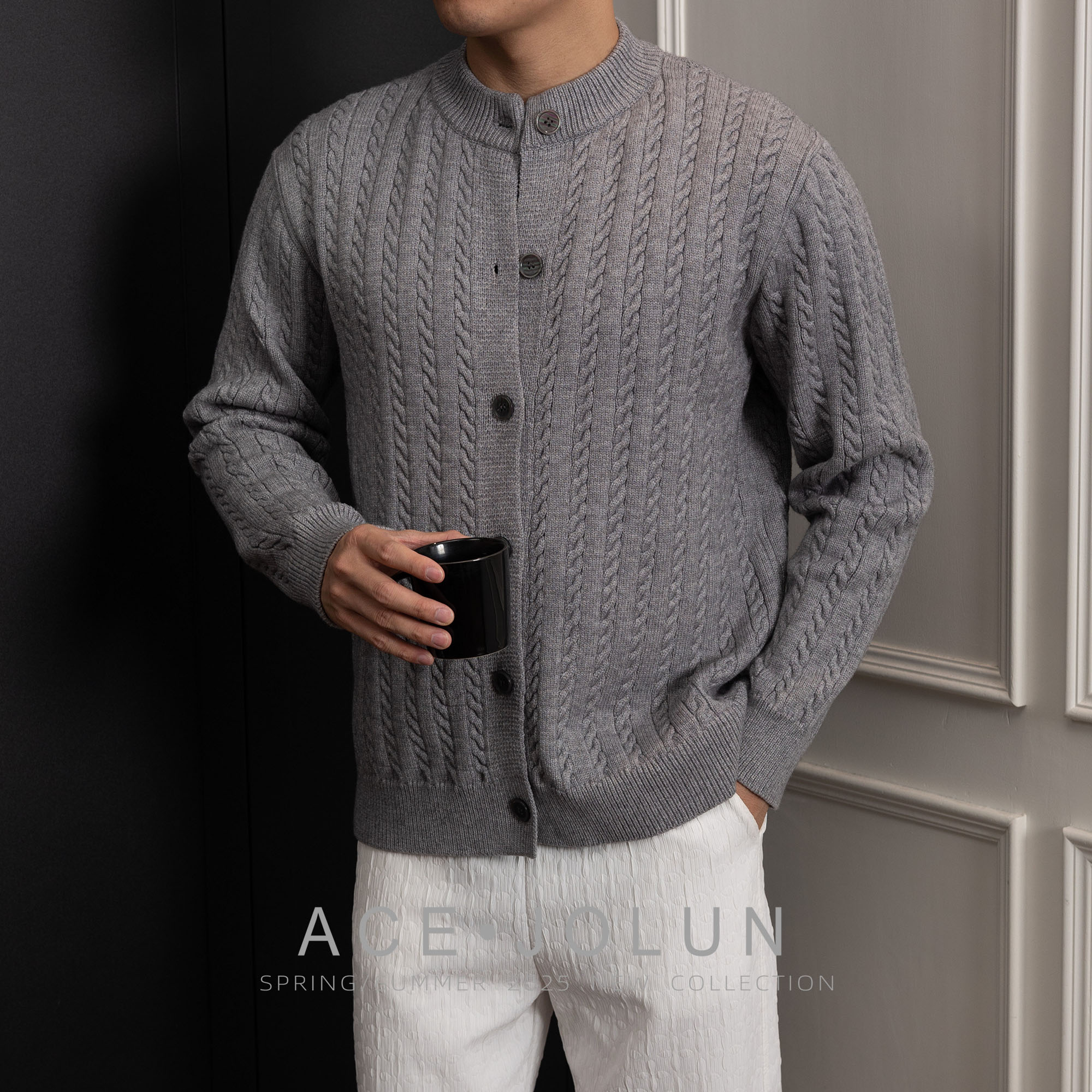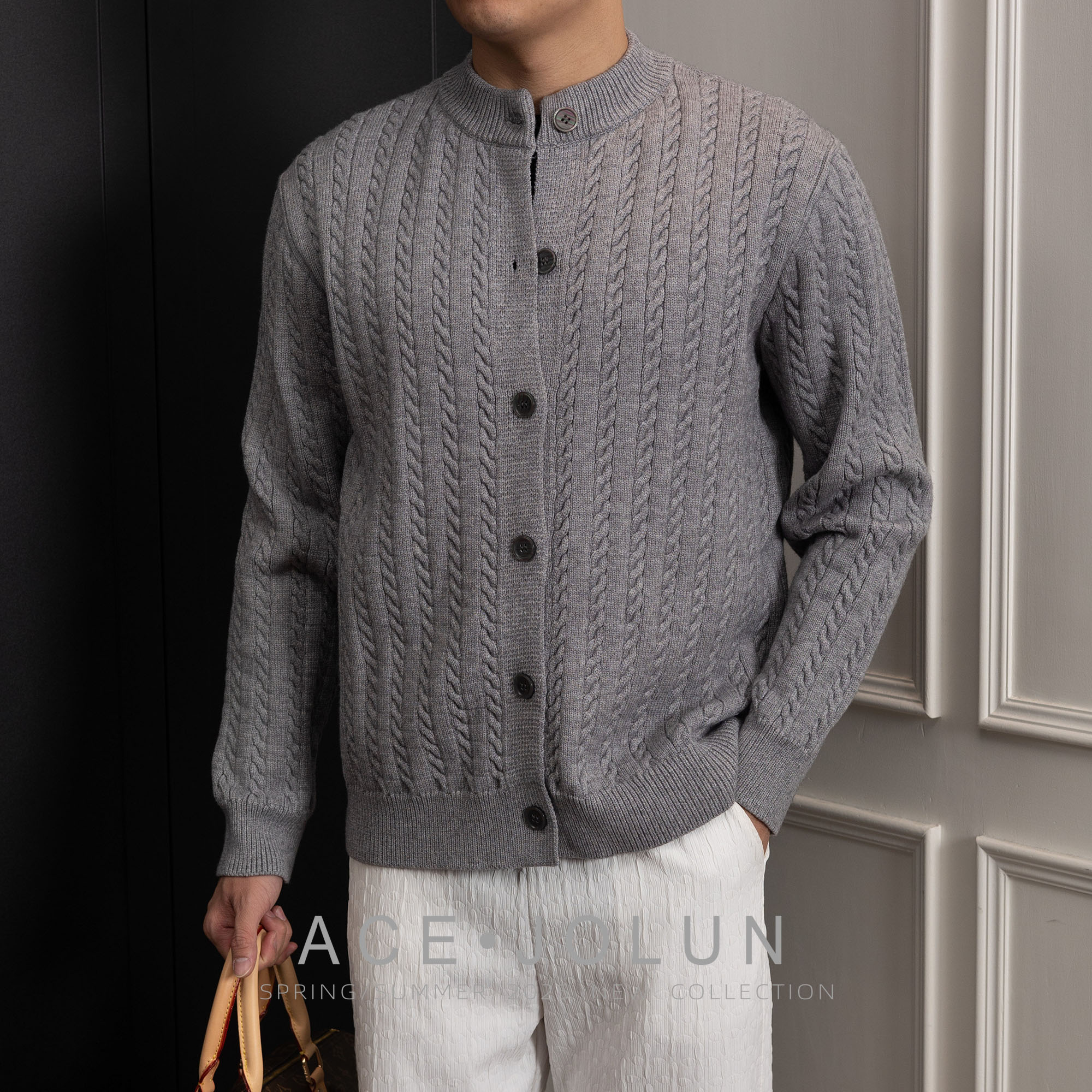 灰色麻花毛衣外套男秋冬季纽扣加厚老钱风男士轻奢高级感针织开衫