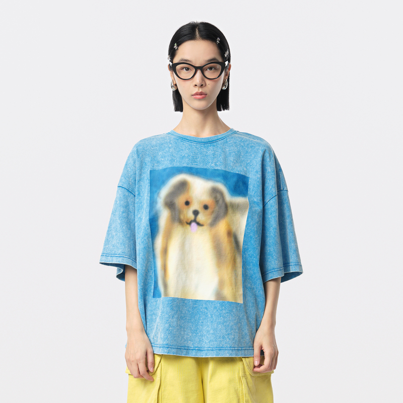MOVEUP幻走2024秋季新款.FUN系列小狗印花设计师纯棉短款T恤女