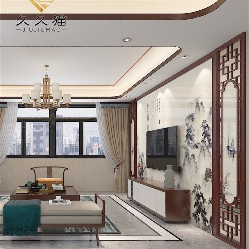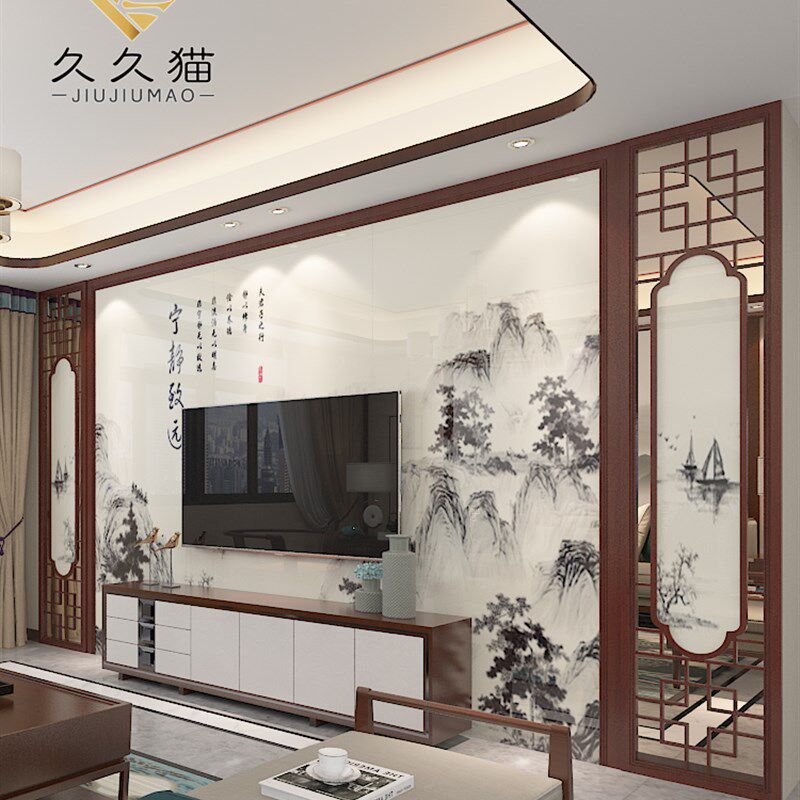 中式电视背景墙瓷砖沙比利实木花格边框背景墙石纹水墨画宁静致远