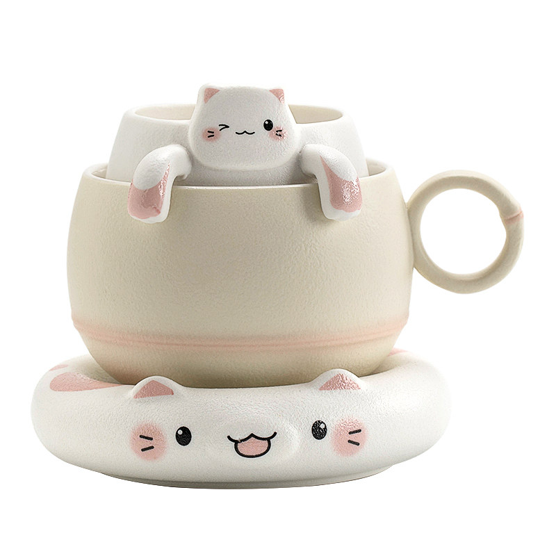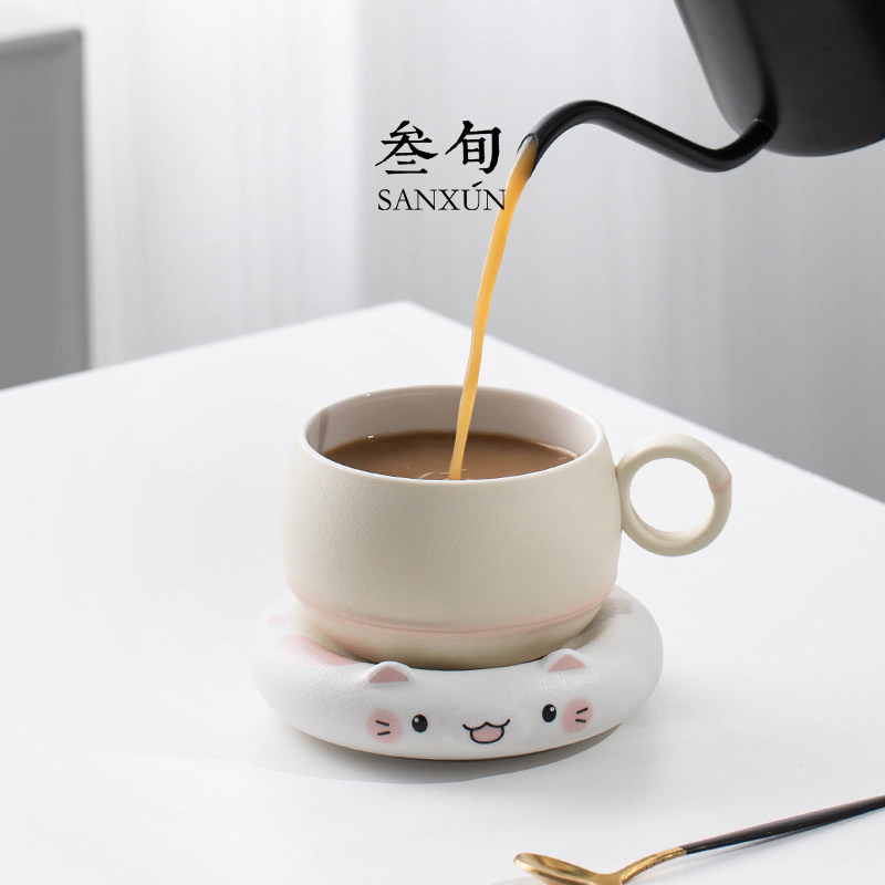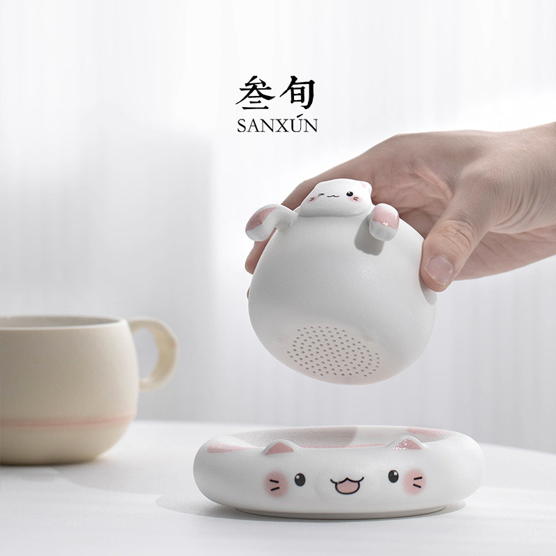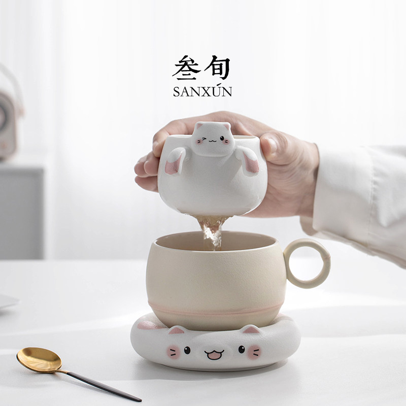 叁旬招财猫泡茶杯陶瓷茶杯茶水分离马克杯创意咖啡杯男女水杯礼物