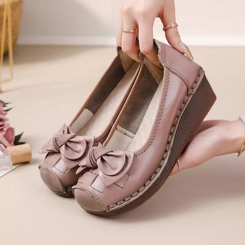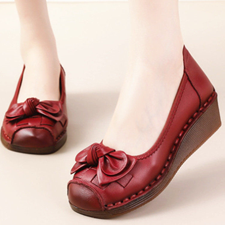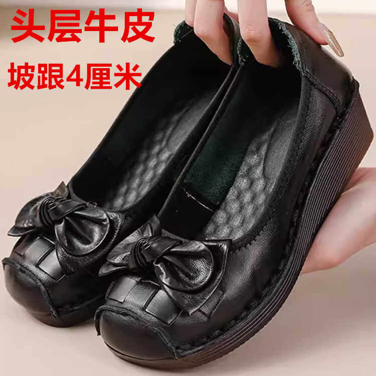 复古真皮软底妈妈鞋春秋新款防滑牛筋底单鞋坡跟中老年蝴蝶结女鞋